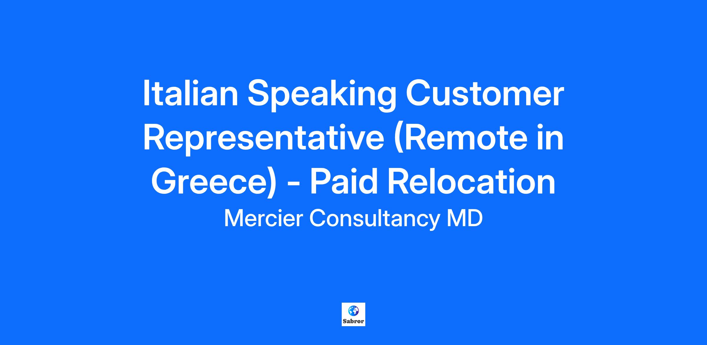 Join Our Team! Are you fluent in Italian and ready for an exciting opportunity to work remotely from Greece? At Mercier Consultancy MD, we are searching for a dedicated and enthusiastic Italian Speaking Customer Representative. This role offers the wonderful benefit of paid relocation to Greece, where you can enjoy a vibrant lifestyle while making a meaningful impact in our customer service team. Your Role: Deliver exceptional customer support to Italian-speaking clients, ensuring their inquiries are handled with professionalism and care. Communicate through various platforms, including phone, email, and chat. Become familiar with our client systems to provide efficient and effective service. Collaborate with your team to ensure timely resolution of customer issues. Fluency in Italian (both written and spoken) is essential for effective communication with clients. Strong interpersonal and communication skills, with a focus on customer satisfaction. Eagerness to learn and adapt to new technologies and tools for remote work. Self-motivated, proactive, and capable of thriving in a fast-paced environment. Open to relocating to Greece for this exciting opportunity! Competitive Monthly Salary Monthly Performance Bonus Fully Paid Relocation Package Fully Paid Training Health Insurance And Much More...