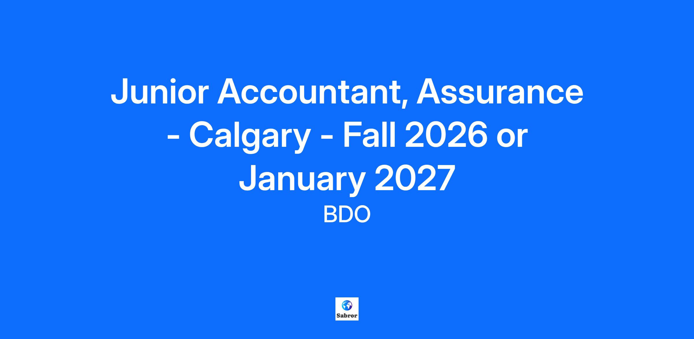 Putting people first, every day BDO is a firm built on a foundation of positive relationships with our people and our clients. Each day, our professionals provide exceptional service, helping clients with advice and insight they can trust. In turn, we offer an award-winning environment that fosters a people-first culture with a high priority on your personal and professional growth. Your Opportunity Our Calgary office is looking for Junior Accountants to join the Assurance team in September 2026 or January 2027 and own the following responsibilities: Efficiently utilize technical knowledge from courses to carry out work projects and assignments Prepare and complete working papers, financial statements, and notice to reader engagements per regulatory standards Gather evidence for Assurance and Accounting engagements Build positive working relationships with clients and effectively respond to request and suggestions Participate in business development initiatives and identify new business opportunities with existing clients Effectively communicate with team members regarding progress updates and issues on an ongoing basis How do we define success for your role? You demonstrate BDO's core values through all aspects of your work: Integrity, Respect & Collaboration You understand your client’s industry, challenges, and opportunities; clients describe you as positive, professional, and delivering high quality work You identify, recommend, & are focused on effective service delivery to your clients You share in an inclusive & engaging work environment that develops, retains & attracts talent You actively participate in the adoption of digital tools and strategies to drive an innovative workplace You grow your expertise through learning & professional development. Your experience and education You have completed your undergraduate degree or diploma and the necessary CPA pre-requisites You have a desire to provide outstanding client service and a commitment to teamwork You have proven leadership skill and can take initiative to seek understanding You display strong problem solving, analytical, and communication skills. Please upload your cover letter, resume, and (unofficial) transcript as one pdf document. Earn your CPA designation: At BDO, we’re committed to the success of students pursuing their CPA designation. We provide pre-approved programs across our 100+ offices, mentorship and support, reimbursement of exam fees, enrollment in Canada’s leading CFE prep course, and flexible options for study leave in order for you to be successful. Why BDO? Our people-first approach to talent has earned us a spot among Canada’s Top 100 Employers for 2025. This recognition is a milestone we’re thrilled to add to our collection of awards for both experienced and student talent experiences. Our firm is committed to providing an environment where you can be successful in the following ways: We enable you to engage with how we change and evolve, being a key contributor to the success and growth of BDO in Canada. We help you become a better professional within our services, industries, and markets with extensive opportunities for learning and development. We support your achievement of personal goals outside of the office and making an impact on your community. Giving back adds up: Where company meets community. BDO is actively involved in our communities by supporting local charity initiatives. We support staff with local and national events where you will be given the opportunity to contribute to your community. Total rewards that matter: We pay for performance with competitive total cash compensation that recognizes and rewards your contribution. We provide flexible benefits from day one, and a market leading personal time off policy. We are committed to supporting your overall wellness beyond working hours and provide reimbursement for wellness initiatives that fit your lifestyle. Everyone counts: We believe every employee should have the opportunity to participate and succeed. Through leadership by our Diversity, Equity and Inclusion Leader, we are committed to a workplace culture of respect, inclusion, and diversity. We recognize and celebrate the valuable differences among each of us, including race, religious beliefs, physical or mental disabilities, age, place of origin, marital status, family status, gender or gender identity and sexual orientation. If you require accommodation to complete the application process, please contact us. Flexibility: All BDO personnel are expected to spend some of their time working in the office, at the client site, and virtually unless accommodations or alternative work arrangements are in place. Our model is a blended approach designed to support the flexible needs of our people, the firm and our clients. It’s about creating work experiences that meet everyone’s needs and providing flexibility to adjust when, where and how we work to meet the expectations of our role. Code of Conduct: Our Code of Conduct sets clear standards for how we conduct business. It reflects our shared values and commitments and includes guiding principles to help us make ethical decisions and maintain trust with each other, our clients, and the public. With your consent, BDO Canada may use AI technology (Microsoft Copilot) to transcribe during preliminary conversations, solely for the purpose of note-taking and not for other purposes, such as resume review, evaluation or selection of candidates. More information on BDO Canada’s Privacy Policy can be found here: Privacy Policy | BDO Canada Ready to make your mark at BDO? Click “Apply now” to send your up-to-date resume to one of our Talent Acquisition Specialists. To explore other opportunities at BDO, check out our careers page. When it comes to our people, we believe in helping you unlock possibilities, build your passions, and grow your competitive edge. From our expansive client base to growing talent pool, our people are