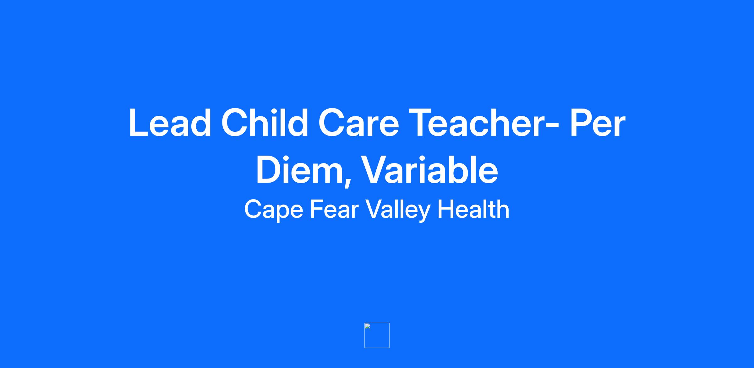 Facility Cape Fear Valley Medical Center Location Fayetteville, North Carolina Department Child Care Services Job Family Professional Work Shift Variable (United States of America) Summary Lead Teacher is to demonstrate positive teaching practices, maintain professionalism, leadership skills, in an effective learning and safe environment. Major Job Functions The following is a summary of the major essential functions of this job. The incumbent may perform other duties, both major and minor, that are not mentioned below. In addition, specific functions may change from time to time: Maintains a positive parent-teacher relationship Interacts appropriately with children Maintains Learning Centers Maintains a warm, inviting child friendly classroom environment Plans and implements Educational programs and daily activities Establishes a weekly schedule and lesson plan Promotes each child's social, emotional, intellectual and physical development Provides a clean, safe and healthy work environment Maintains accurate records Documents children's progress and completes all State required documents Provides instruction for Teachers Manages children's behavior Comply with the provisions of the Child Maltreatment Reporting Act by bringing any suspected cases of child maltreatment to Director or Co-Director for possible reporting to the designated reporting agency Other duties as assigned Minimum Qualifications The following qualifications, or equivalents, are the minimum requirements necessary to perform the essential functions of this job: Education and Formal Training: Associateās degree in Early Childhood Education or related field required CPR and First Aid certifications required Infant Toddler Safe Sleep (ITS-SIDS) certification required Work Experience: 1 year of responsible classroom experience in a professional large Child Care Center required Knowledge, Skills, and Abilities Required: Knowledge of physical, intellectual, emotional, and social characteristics of children ages birth-five years old and up to 12 years old for Weekend Care Knowledge of State Child Care regulations Physical Requirements: Work involves a variety of activities to include walking, standing and lifting of children and various objects Ability to stand for 30 minutes Ability to communicate clearly, effectively, and age appropriately Required Licenses and Certifications Cape Fear Valley Health System is an Equal Opportunity Employer M/F/Disability/Veteran/Sexual Orientation/Gender Identity For exceptional healthcare come to Cape Fear Valley Health where caring employees are committed to integrity, patient-centeredness and excellence throughout the entire healthcare process. At Cape Fear Valley Health, our goal is to improve the quality of every life we touch. Our diverse team of doctors, nurses and staff work together to create a better experience for every patient, every time. Cape Fear Valley is a 950-bed, 8-hospital regional health system, the 8th largest in North Carolina, with more than 1 million inpatient and outpatients annually. A private not-for-profit organization with over 7,000 employees and 850 physicians. Our employees and physicians proudly serve a seven-county region of southeastern North Carolina, including Fayetteville, Fort Bragg, Hope Mills, Raeford, Lumberton, Elizabethtown, Clinton, Lillington, Dunn and beyond. Our medical facilities include Cape Fear Valley Medical Center, Highsmith-Rainey Specialty Hospital, Cape Fear Valley Rehabilitation Center, Behavioral Health Care, Bladen County Hospital, Hoke Hospital, Central Harnett Hospital, Betsy Johnson Hospital, as well as more than 60 medical offices and specialty care clinics spread throughout the Cape Fear region.