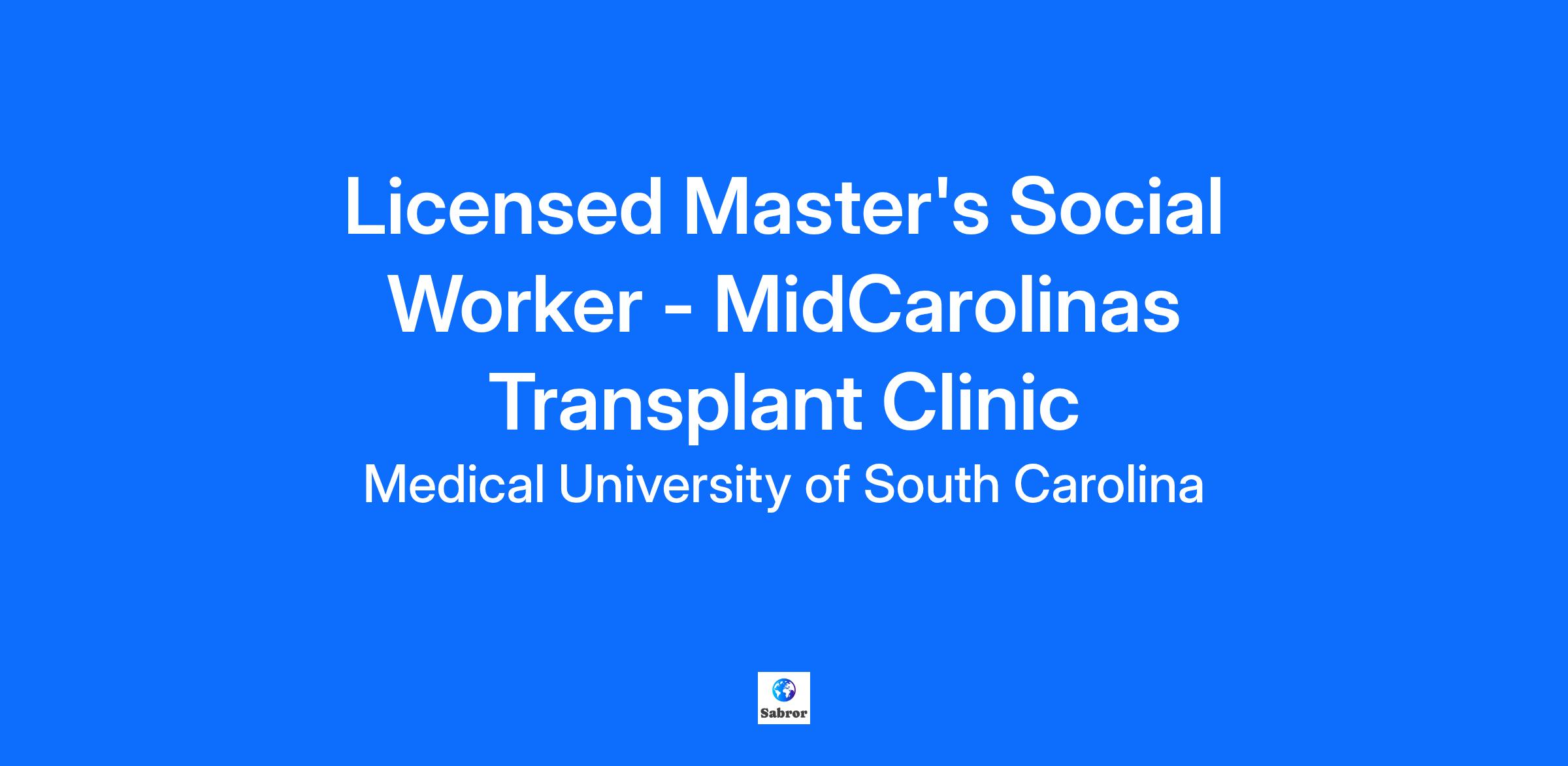 Job Description Summary Our innovative medical transplant team is rapidly growing and looking for another Licensed Master's Social Worker to join their team. Entity Medical University Hospital Authority (MUHA) Worker Type Employee Worker Sub-Type Regular Cost Center CC001513 LAN - Nephrology Transplant (LMC) Pay Rate Type Salary Pay Grade Health-27 Scheduled Weekly Hours 40 Work Shift Day (United States of America) Job Description Benefits: South Carolina State Health Insurance South Carolina State Retirement Competitive pay Paid Parental Leave Provides solid organ transplant social work services for facilitating solutions to the medically related psychosocial/environmental problems of patients and families. Ensures the continuity of patient care by implementing interventions which may include initial and annual assessments, identifying mental health disorders, brief behavioral health interventions, information, and referral, during hospitalization and/or outpatient treatment. May provide educational support to staff. Participates in quality meetings and committees. Collaborates with the multi-disciplinary team. Knowledgeable in ESRD Medicare and able to assist patients with maintaining adequate health care coverage. Maintains a positive working relationships with vendors and external agencies to access services for patients. The individual must possess the ability to clinically assess and treat emotional mental health issues and identify and address psychosocial barriers. Master’s degree in social work and licensure required. Minimum of one year of current experience in a clinic, hospital, medical setting, or health care field preferred. This position participates in an on-call rotation of the Organ Transplant Social Work Team. Experience with transplant patients or dialysis patients preferred. Experience: 2-4 years of experience in the field or in a related area. Familiar with standard concepts, practices, and procedures within a particular field. Additional Job Description Education: Master's degree in Social Work or Social Welfare program accredited by the Council on Social Work Education required. Licensure/Certificates: Licensed Master's Social Worker or Licensed Independent Social Work - Clinical Practice (LISW-CP) in South Carolina required. If you like working with energetic enthusiastic individuals, you will enjoy your career with us! The Medical University of South Carolina is an Equal Opportunity Employer. MUSC does not discriminate on the basis of race, color, religion or belief, age, sex, national origin, gender identity, sexual orientation, disability, protected veteran status, family or parental status, or any other status protected by state laws and/or federal regulations. All qualified applicants are encouraged to apply and will receive consideration for employment based upon applicable qualifications, merit and business need. Medical University of South Carolina participates in the federal E-Verify program to confirm the identity and employment authorization of all newly hired employees. For further information about the E-Verify program, please click here: http://www.uscis.gov/e-verify/employees Thank you for wanting to be part of the Medical University of South Carolina team. Whether you want to teach the next generation of health care leaders, innovate new business models, discover the next breakthrough or provide patient care, there's a role for you that fuels your passion and takes advantage of your skills. There are career opportunities available in academics, research, hospital medicine, physician practices and support services, from patient billing to IT. As an applicant, you can search jobs for all MUSC entities as well as search by category and location. MUSC attracts more than $250 million annually in research funding, making it the biggest magnet for biomedical, extramural research dollars of all institutions of higher learning in South Carolina. The Clinical and Translational Science Award (CTSA) Program aims to advance clinical and translational science to increase the speed at which new treatments become available to patients. MUSC Health, the clinical enterprise, operates a 750 bed medical center, which includes a nationally recognized Children’s Hospital, the Ashley River Tower (cardiovascular, digestive disease, and surgical oncology), Hollings Cancer Center (one of fewer than 70 elite National Cancer Institute designated centers), a Level I Trauma Center and the Institute of Psychiatry. In addition, there are more than 100 outreach clinics, hospital/health system affiliations, and telehealth sites. U.S. News & World Report placed us among the top one percent of all American hospitals, with 11 specialties in the top 50. The MUSC Medical Center is also one of only three Magnet® designated hospitals in South Carolina.