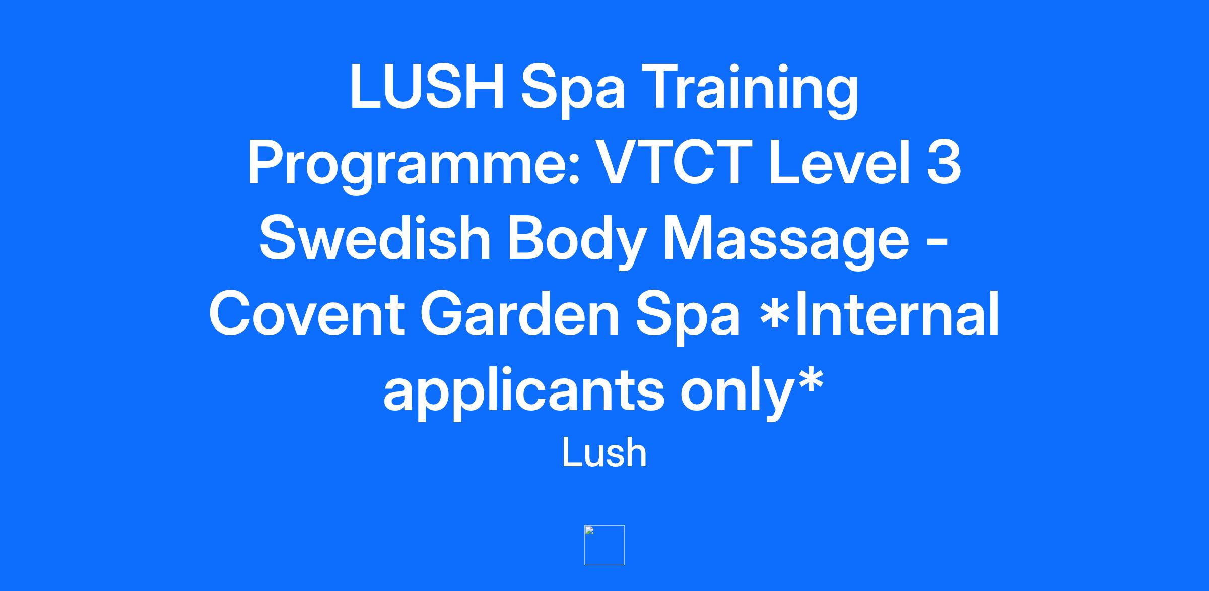 LUSH Spa Training Programme: VTCT Level 3 Swedish Body Massage - Covent Garden Spa *Internal applicants only* Application Deadline: 20 January 2026 Department: Spa Employment Type: Permanent - Part Time Location: Covent Garden Reporting To: Covent Garden Spa Management Compensation: £14.15 - £15.15 / hour Description **Internal applicants only** Lush Spa are looking for passionate and enthusiastic members of staff who wish to train and qualify in body massage with a view to a career as a hybrid Lush Spa therapist. The hybrid role would allow this person to work within the spa but also display their excitement and knowledge for the spa project whilst driving the sales and business from the shop floor, spa reception or elsewhere within the Spa Store. This advertisement is for a place on the VTCT Level 3 Certificate in Swedish Body Massage qualification course only. On completion of the course, you will be required to undertake a hybrid role within the spa store. The hybrid role would allow this person to work within the spa but also display their excitement and knowledge for the spa project whilst driving the sales and business from the shop floor, spa reception or elsewhere within the Spa Store. Course outline and Requirements: This is a unique opportunity to earn an internationally recognised Level 3 qualification in Swedish Body Massage, which is governed by an external company - VTCT. Therefore the candidate should have great knowledge and experience within Lush Cosmetics and have a deep understanding and passion for our Spa treatments and concepts. On successful completion of the VTCT course you will receive detailed feedback on your performance during this training. This will then determine your progression to become a Lush Spa Therapist. The Lush Spa therapist position is not guaranteed until successful in this final stage. For applicants that are multilingual, the course will require a good level of spoken and written English as it is led and assessed in this language. Course Outline Self study topics - ALL qualifications will include an element of revision or homework. The Lush Spa will be funding this qualification and around 180 hours of paid learning, it is therefore required that the following three unit assignments are completed in the learners own time and unpaid. All resources and information on how to complete these will be given to all learners. Health and Safety Unit Client Care and Communication Unit How to provide a Swedish Body Massage Unit Theory elements will be taught and completed online/ virtually and teacher led Anatomy and Physiology - 10 Body systems Practical elements will be taught onsite in the Lush Spa Training Centre in Poole Massage movements and practically providing a body massage Health and safety Full body massage routine accompanied to music Practical assessments & exams Upcoming Training Schedule Teacher Led theory training will commence on: Monday 16th March 2026 Monday - Friday: 9am - 2pm for 3 weeks. Self Led theory training will commence as soon as the candidate has been hired. Practical training will commence on: Monday 6th April 2026 Monday - Friday: 8am - 4pm for 3 weeks. Compulsory Lush Spa Training: Monday 27th April 2026 Monday - Friday: 8am - 4pm for 3/4 weeks dependant on the need of the spa Course Requirements: Skills, Knowledge and Expertise Be fluent in English (reading, writing and speaking). At least 3 months experience working within Lush. No previous qualifications in massage are required, however a keen interest in Anatomy & Physiology is a bonus. Be available for 9 weeks training: See below for dates. Embody Lush five star standards, customer service & ethics. To be organised, resourceful and adaptable. Basic understanding of IT equipment and the ability to submit work online. Proactive with self-development and learning. Proven record of punctuality and reliability. Previous shop-floor or spa roles are a bonus. Extra Information: Hours: Theory training is 22.5 hours per week, Monday - Friday. There will also be homework which is unpaid and to be completed in your own time. Practical training will require you to work 37.5+ hours per week, Monday - Friday. As soon as you can - Please speak with your management team to ensure you can create a training/ working plan to cope with the large workload you will have, to complete the coursework. There will be a reasonable amount of homework to do in your own time and we want to ensure each individual has a plan to manage their time well. Accommodation: Accommodation is provided by Lush when training in Poole. Travel: Travel to and from Poole will be organised and funded by Lush. Any other travel is discussed with your management team and at the expense of your store or yourself. Relocation: Relocation packages will be discussed once you have been offered a spa contract. Time to find accommodation will be given once a spa position has been confirmed. Spa Contract: Prior to starting the VTCT qualification course, a separate spa training contract must be signed. This contract stipulates that, because Lush is funding this new career path, you are obligated to work in a hybrid/ therapist role for 12 months following the course completion date. Failure to meet this requirement will mean you are obligated to repay a portion of the investment into your training. Benefits This course is fully funded by Lush to develop and progress loyal and hardworking staff members by training them to become a fully qualified Spa Therapist. You are paid for your Guided Learning Hours in training. Full, in depth - 5* training from a team awarded excellence in their feild. If successful - Candidates will be awarded a full qualification in Swedish body massage. As internationally recognised, qualified massage therapists - Candidates can progress with learning Lush Spa Treatments. With this new career, therapists will learn a variety of new skills, be given opportunities for CPD and learn about and showcase innov