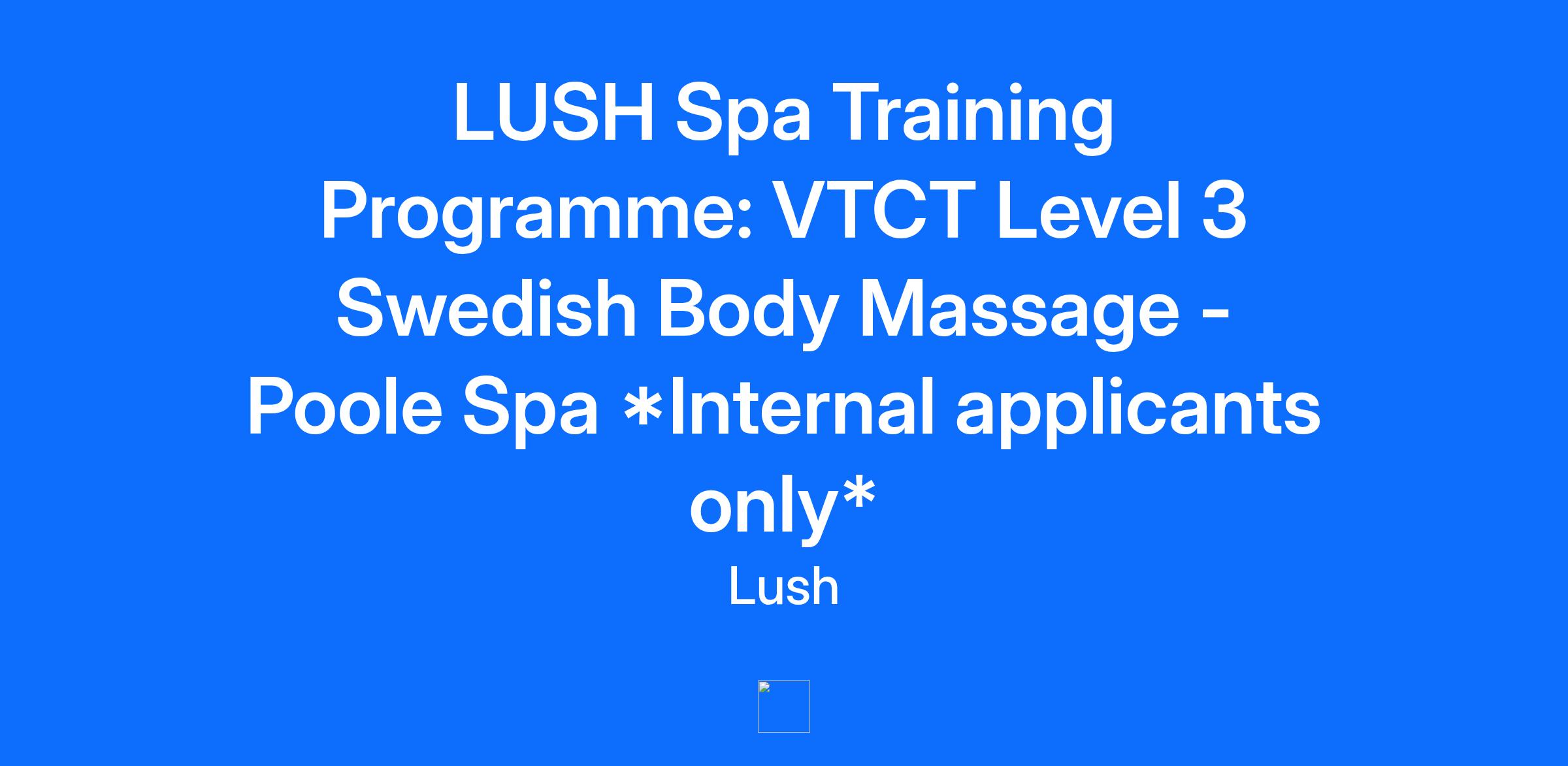 LUSH Spa Training Programme: VTCT Level 3 Swedish Body Massage - Poole Spa *Internal applicants only* Application Deadline: 20 January 2026 Department: Spa Employment Type: Permanent - Part Time Location: Poole (Spa Store) Reporting To: Poole Spa Management Compensation: £13.00 - £14.00 / hour Description **Internal applicants only** Lush Spa are looking for passionate and enthusiastic members of staff who wish to train and qualify in body massage with a view to a career as a hybrid Lush Spa therapist. The hybrid role would allow this person to work within the spa but also display their excitement and knowledge for the spa project whilst driving the sales and business from the shop floor, spa reception or elsewhere within the Spa Store. This advertisement is for a place on the VTCT Level 3 Certificate in Swedish Body Massage qualification course only. On completion of the course, you will be required to undertake a hybrid role within the spa store. The hybrid role would allow this person to work within the spa but also display their excitement and knowledge for the spa project whilst driving the sales and business from the shop floor, spa reception or elsewhere within the Spa Store. Course outline and Requirements: This is a unique opportunity to earn an internationally recognised Level 3 qualification in Swedish Body Massage, which is governed by an external company - VTCT. Therefore the candidate should have great knowledge and experience within Lush Cosmetics and have a deep understanding and passion for our Spa treatments and concepts. On successful completion of the VTCT course you will receive detailed feedback on your performance during this training. This will then determine your progression to become a Lush Spa Therapist. The Lush Spa therapist position is not guaranteed until successful in this final stage. For applicants that are multilingual, the course will require a good level of spoken and written English as it is led and assessed in this language. Course Outline Self study topics - ALL qualifications will include an element of revision or homework. The Lush Spa will be funding this qualification and around 180 hours of paid learning, it is therefore required that the following three unit assignments are completed in the learners own time and unpaid. All resources and information on how to complete these will be given to all learners. Health and Safety Unit Client Care and Communication Unit How to provide a Swedish Body Massage Unit Theory elements will be taught and completed online/ virtually and teacher led Anatomy and Physiology - 10 Body systems Practical elements will be taught onsite in the Lush Spa Training Centre in Poole Massage movements and practically providing a body massage Health and safety Full body massage routine accompanied to music Practical assessments & exams Upcoming Training Schedule Teacher Led theory training will commence on: Monday 16th March 2026 Monday - Friday: 9am - 2pm for 3 weeks. Self Led theory training will commence as soon as the candidate has been hired. Practical training will commence on: Monday 6th April 2026 Monday - Friday: 8am - 4pm for 3 weeks. Compulsory Lush Spa Training: Monday 27th April 2026 Monday - Friday: 8am - 4pm for 3/4 weeks dependant on the need of the spa Course Requirements: Skills, Knowledge and Expertise Be fluent in English (reading, writing and speaking). At least 3 months experience working within Lush. No previous qualifications in massage are required, however a keen interest in Anatomy & Physiology is a bonus. Be available for 9 weeks training: See below for dates. Embody Lush five star standards, customer service & ethics. To be organised, resourceful and adaptable. Basic understanding of IT equipment and the ability to submit work online. Proactive with self-development and learning. Proven record of punctuality and reliability. Previous shop-floor or spa roles are a bonus. Extra Information: Hours: Theory training is 22.5 hours per week, Monday - Friday. There will also be homework which is unpaid and to be completed in your own time. Practical training will require you to work 37.5+ hours per week, Monday - Friday. As soon as you can - Please speak with your management team to ensure you can create a training/ working plan to cope with the large workload you will have, to complete the coursework. There will be a reasonable amount of homework to do in your own time and we want to ensure each individual has a plan to manage their time well. Accommodation: Accommodation is provided by Lush when training in Poole. Travel: Travel to and from Poole will be organised and funded by Lush. Any other travel is discussed with your management team and at the expense of your store or yourself. Relocation: Relocation packages will be discussed once you have been offered a spa contract. Time to find accommodation will be given once a spa position has been confirmed. Spa Contract: Prior to starting the VTCT qualification course, a separate spa training contract must be signed. This contract stipulates that, because Lush is funding this new career path, you are obligated to work in a hybrid/ therapist role for 12 months following the course completion date. Failure to meet this requirement will mean you are obligated to repay a portion of the investment into your training. Benefits This course is fully funded by Lush to develop and progress loyal and hardworking staff members by training them to become a fully qualified Spa Therapist. You are paid for your Guided Learning Hours in training. Full, in depth - 5* training from a team awarded excellence in their feild. If successful - Candidates will be awarded a full qualification in Swedish body massage. As internationally recognised, qualified massage therapists - Candidates can progress with learning Lush Spa Treatments. With this new career, therapists will learn a variety of new skills, be given opportunities for CPD and learn about and showcase innovative produc