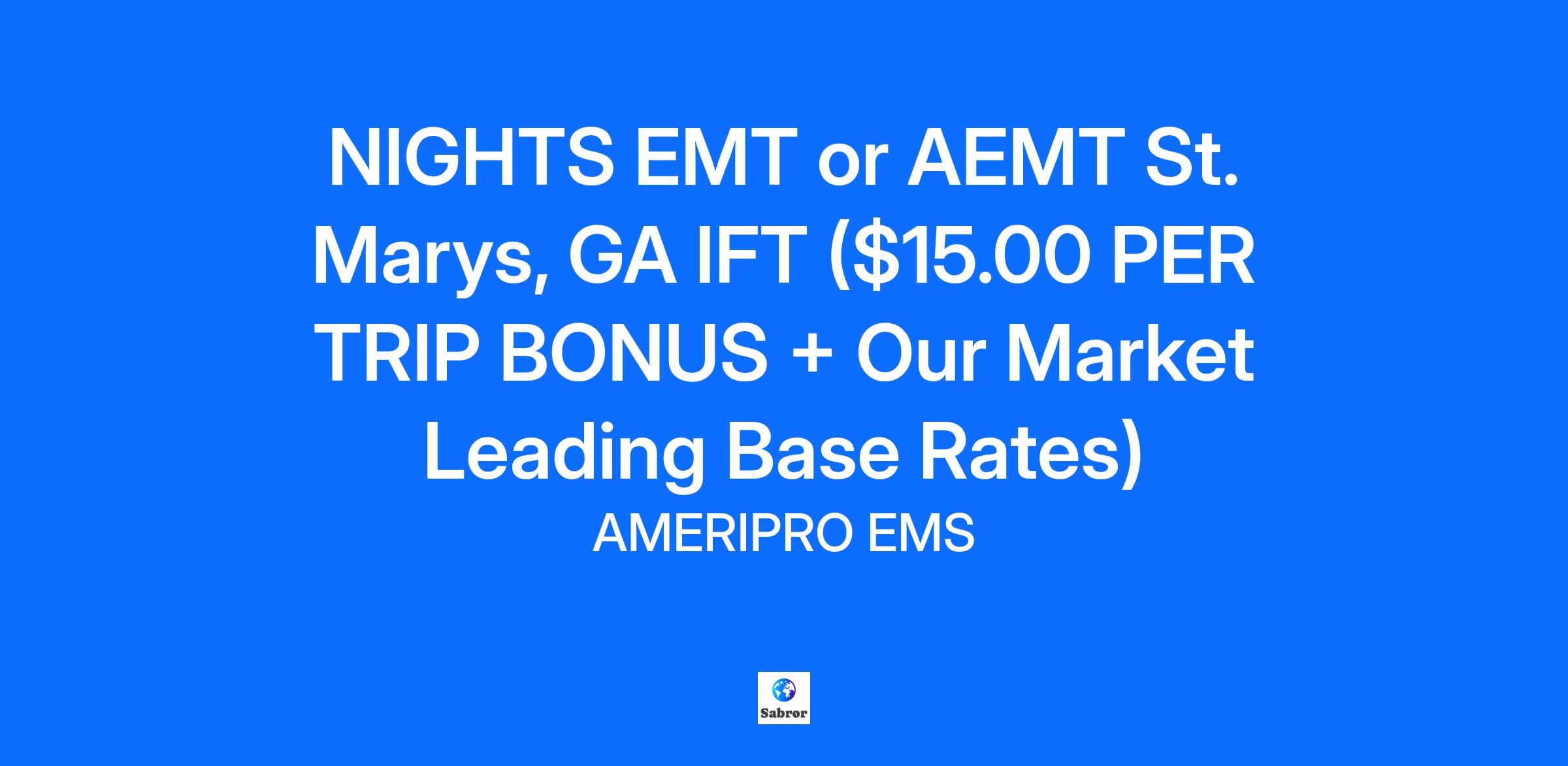 Job Details Job Location: St Marys, GA Position Type: Full Time Salary Range: Undisclosed Job Shift: 12 Hour Description EMT - St. Marys, Georgia EMS Service line: IFT FTE: Full Time Shift availability: 3p - 3a California Rotation (California 12s – alternating 2 days on / 2 days off / 3 days on one week, then 2 days on / 3 days off / 2 days on the next, averaging 42 hours per week with every other weekend off.) Redefining what is possible: Giving you the power to control your income potential through performance! Your Effort - Your Results! New Pay Per Trip Incentive $15 for every trip completed – starting with your first trip of the shift No cap – the more you run, the more you earn On top of your regular hourly pay Certain qualifications must be met to be eligible $15.00 PER TRIP BONUS AVAILABLE IN Jacksonville IFT, Lake City IFT, and St Marys & Brunswick, GA - IFT Example: 6 transports in a 12-hour shift = an extra $90 in your pocket. Run 10 transports? That’s $150 more – plus your normal pay. At AmeriPro Health, the standard is not something we chase – it is something that we have defined. We set the measure of excellence, and we keep building it every day. Certification/Licensure Requirements: Georgia EMT certification in good standing Current National Registry certification {if required by state} Current CPR: BLS certification. Valid state specific Drivers’ license. FEMA IS certs: (IS-100; IS-200; IS-700; IS-800) SIGN-ON BONUS: Sign-On Bonus Available for Full-Time certified EMTs in Georgia! We’re excited to offer a Sign-On Bonus to qualified, full-time EMTs who join our dedicated team! If you're passionate about providing exceptional care and making a difference in the community, Join AmeriPro: Where Your Passion is Valued and Your Dedication is Truly Appreciated! About AmeriPro Health: AmeriPro Health is committed to exceeding expectations by delivering exceptional patient outcomes, optimizing care efficiency, and providing unmatched access to the highest quality healthcare. Join our team as a EMT and contribute your skills and dedication to our mission of delivering outstanding care to those who need it most. Critical Care Advanced Life Support Basic Life Support Medical transportation And much more Value based services & equipment: Paramedic Advanced Life Support Ambulances New Quick Response Units State-of-the-art equipment Zoll® X Series cardiac monitors Zoll EMV+® ventilators Sapphire transport infusion pump LUCAS devices on 911 units Compensation and Benefits: Benefits for Full-time positions include: Competitive compensation (above market rates) Paid Time Off Benefits package: (Medical; Dental; Vision; short-term disability; Life, Accident and Cancer insurance policies, and more) 401(k) retirement plan with a company match Paid uniforms Tuition reimbursement Employee Referral Bonuses Opportunities for overtime Professional development & opportunities for advancement Flexible scheduling options Employee assistance programs (EAP) We foster a positive work environment Job Description: Summary Provides patient care in both the emergency and non-emergency environment. Ensures compliance with all State EMS rules and regulations. Checks and maintains all ambulance equipment and vehicle to insure it is clean and in proper working condition. Maintains all company required licenses and certifications for an EMT position. Essential Duties and Responsibilities: Respond to all calls for service dispatched from the AmeriPro EMS communications center as directed. Provide care and treatment to patients according to company policy and the company medical director protocols. Ensures ambulance and all equipment is cleaned and checked daily. Any deficiencies should be reported immediately to the shift supervisor or Director of Operations. Prepares and completes appropriate reports including Patient Care Reports (PCR), billing, exposure reports, incident reports, daily, weekly and monthly unit check offs. Ensures unit and crewmembers adhere to AmeriPro EMS policies, procedures, guidelines, directives and standards. Reports any deficiencies to the shift supervisor or Director of Operations. Ensures vehicle placed in-service comply with required laws, rules license, and regulations as outlined by the State of Florida and other authorized agencies. Prompt and regular attendance at work and mandatory meetings. Maintain a state of readiness and professionalism while on-duty. Maintain a professional appearance and conduct while in company uniform either on or off duty. Self motivated and requires little supervision and direction. Performs other such duties as may be required Demonstrates the ability to safely lift, transfer and maneuver patients in and out of ambulances, facilities, residences and other locations. Qualifications EMT Job Qualifications: REQUIRED Qualifications: High school diploma, GED, or equivalent qualification. State specific Emergency Medical Technician certification / licensure in good standing / current NREMT certification if applicable by state law Current CPR: BLS certification. Valid state specific Drivers’ license. Successful completion of a comprehensive background check and drug screening. Strong people skills and proven ability to collaborate within a team. Proficient verbal and written communication skills, with the ability to comprehend and execute verbal and written instructions in English. FEMA IS certs: (IS-100; IS-200; IS-700; IS-800) Preferred Qualifications: Previous experience working as an EMT or in a similar medical role. Pre-Hospital Trauma Life Support (PHTLS) and/or International Trauma Life Support (ITLS) training Knowledge, Skills and Ability: Knowledge of methods and techniques for providing on-site emergency medical services. Knowledge of company medical director approved protocols and standing orders. Ability to read and interpret local maps. Demonstrated skills in the successful completion of multiple, simultaneous and rapidly eme