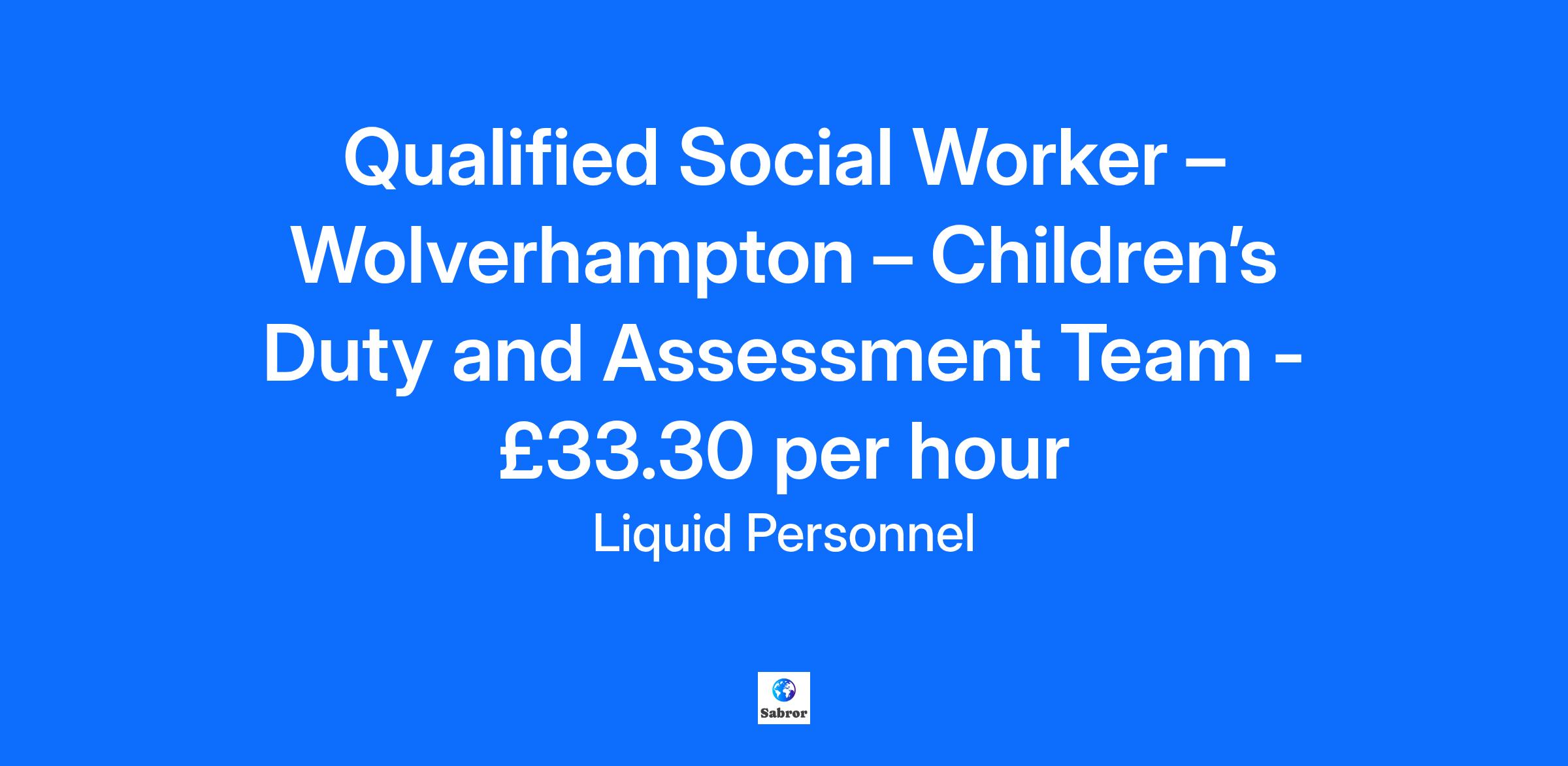 Job Title: Qualified Social Worker – Duty and Assessment Team Location: Wolverhampton Rate: £33.30 per hour Liquid Personnel is currently recruiting experienced Qualified Social Workers to join a busy team at a Wolverhampton based Duty and Assessment Team. To work in this role, you must have Social Work England registration, be eligible to work in the UK, hold a qualification in Social Work at degree level, and have post-qualified experience. What will your responsibilities be? Working collaboratively with other professionals/agencies to meet the identified needs of children, young people, and their families, including the MASH Service, Police, and Education Services. Working within a fast-paced Duty Team and acting on referrals from the MASH (Multi Agency Safeguarding Hub). Attending to Section 47 enquiries. Completing Single Assessments. Benefits: Flexible/Hybrid working opportunities Manageable caseload Excellent rate of pay Condensed working and part-time roles can be discussed Qualifications and Experiences: Social Work England registration Eligible to work in the UK Hold a full UK licence Post-qualified experience Degree level or equivalent in Social Work How to apply? If this is a job for you, feel free to click apply below or if you want to learn more about it, please contact 0345 241 9590. Why Liquid Personnel? New ‘Faster Pay’ service getting you paid more quickly Twice weekly payroll Free DBS and compliance service Access to exclusive roles that aren’t available from other agencies Free access to Liquid’s exclusive social work training and CPD portal Your own dedicated consultant with extensive social work knowledge Access to a wide selection of social work positions across the UK “Refer a Friend” bonus – get £250 for each social worker you refer who we successfully place* “Find your own job” bonus – get £250 for bringing your own position to us * Liquid Personnel is an equal opportunities employer. Liquid Personnel Ltd is acting as an Employment Business in relation to this vacancy. * Terms and conditions apply to our bonus schemes. Reasonable Adjustments: We are unable to support or accept applications from candidates who are residents within the Red or Amber list of the Code of practice for the international recruitment of health and social care personnel in England, based on the World Health Organisation (WHO) Workforce Support and Safeguard List. GH: 17772 BH: 172201