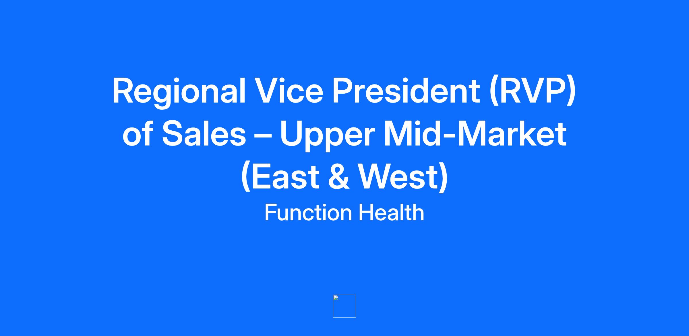 Segments Covered: Employers with 5,000–14,999 employees Role Type: Senior IC Locations: East Region & West Region (two roles) About the Role The Regional Vice President (RVP) of Sales owns upper mid-market acquisition for employers with 5,000–14,999 employees. This industry-standard title aligns Function with competitive benefits-industry norms,and signals seniority when partnering with sophisticated buyers. You will be responsible for building strategic relationships with large employers and major consulting firms to drive Function’s expansion in a critical growth segment. Responsibilities Strategic Enterprise-Adjacent Selling Lead full-cycle sales for mid-large employers across assigned territory. Build deep relationships with national and regional benefits consulting firms. Architect complex program designs, pricing structures, and launch plans. Cross-Functional Collaboration Partner with Marketing, Product, Clinical, and Customer Success counterparts. Influence roadmap by synthesizing segment-level insights and employer feedback. Activation & Growth Ensure high-quality launch execution and activation outcomes. Educate consultants and internal teams on Function’s differentiated clinical and preventive model. Expansion Ownership (Months 0–9) Drive contract expansion opportunities during early adoption. Quota Expectations Quarterly quotas aligned to 6–8 new logos per year. Standard new-hire ramp schedule (50% → 75% → 100%). Qualifications 8–12+ years of high-performance B2B sales experience in health/benefits. Demonstrated success selling into large mid-market or lower enterprise accounts. Strong broker/consultant channel relationships. Ability to manage long, complex sales cycles and executive-level discussions. Our commitment to diversity and inclusion We're aiming to build a diverse team and an inclusive company culture. We are an equal opportunity employer and do not discriminate based on race, ethnicity, nationality, religion, sex, gender, gender identity, gender expression, sexual orientation, age, disability, veteran status, genetic information, marital status, or any legally protected status. Important Notice: Legitimate communication from the Function Health team will always come from an email address ending in @functionhealth.com. Function Health will never request personal information such as banking details or payment during the hiring process. Please be cautious of communications or job offers that come from other email domains, instant messaging platforms, or unsolicited calls. If you ever have doubts about the legitimacy of a communication, please reach out to us directly at talent@functionhealth.com.