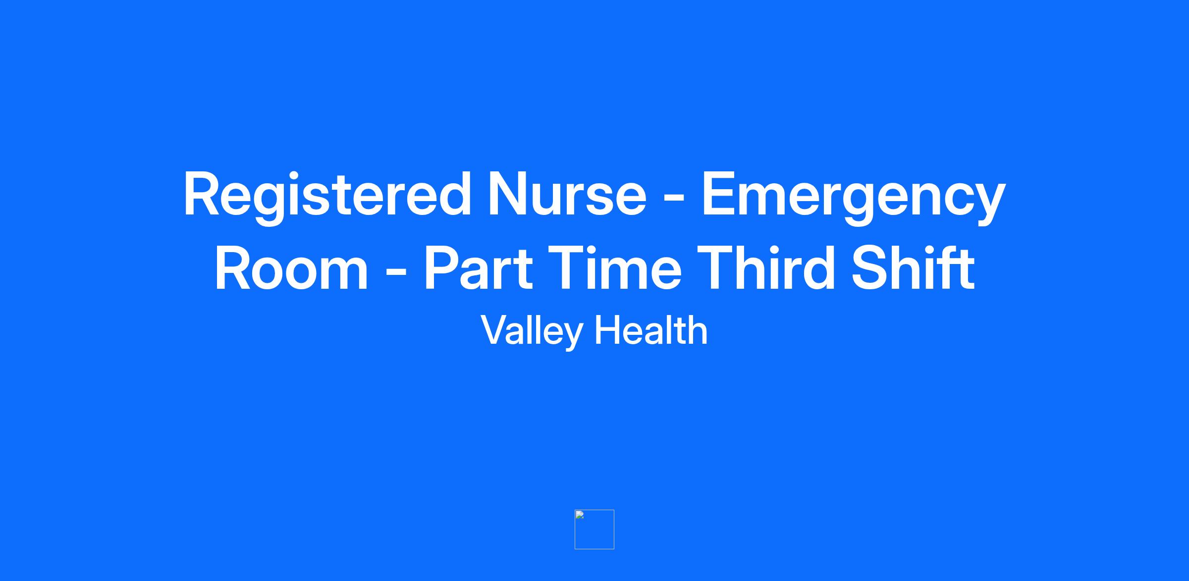 Department EMERGENCY ROOM NURSING - 806230 Worker Sub Type Regular Work Shift Third Shift (United States of America) Pay Grade 135 Job Description The registered professional nurse is responsible for utilizing job skills to effectively carry out the nursing process: including assessment, diagnosis, outcomes identification, planning, evaluation, documentation and time management. They responsible for quality communication, teamwork and leadership/professionalism. Also directs, coordinates and implements patient teaching, quality/safety initiatives, and activities of other health team personnel while maintaining standards of professional nursing. A Registered Nurse II (RN II) is responsible for the care of the population they are assigned. A RN II is required to complete yearly mandatory competencies, any unit specific competencies that are identified by the Director/Designee as it relates to the patient population of their unit as well as completion of the Professional Practice Ladder requirements which include: Assuming responsibility as Charge Nurse, PI Activity and department initiatives, communicates and shares information to Director/Designee and co-workers from unit or hospital committee, a Valley Health paid Education/Seminar/Conference workshop or Nursing Article. Portfolio is current and submitted to Director/Designee annually by March 1st. Routinely solicits and validates patient/family satisfaction, participates in peer review for unit and develops bulletin board or poster that provides educational information to staff/patients/family members. Education Associates Nursing (RN Diploma, ASN or ADN) is required. Bachelors Nursing (BSN) is preferred. Experience Advancement to this level requires a minimum of 1872 full-time or part-time hours (936 if hold BSN) of RN experience and completion of a performance evaluation. Certification & Licensures RN License is required. Based on primary state of residency and in accordance with current Virginia Board of Nursing Regulations, must be licensed or eligible to practice pending licensure as a Registered Nurse in the Commonwealth of Virginia with either a: Multi-state license, under the Nurse Licensure Compact OR Single-state license, valid in Virginia only. BLS Certification (Basic Life Support) - American Heart ‘Healthcare Provider’ (HCP) - AHA approved required. New hires must have American Heart Association (AHA) appropriate certification prior to completion of orientation. Relevant Specialty Certification is preferred. Qualifications Meets all requirements of a RN I. Competent to provide care based on the cognitive, physical, emotional and chronological stages of human growth and development. Competent to provide care using the nursing process. Must have a reliable means of phone communication with hospital. Benefits At Valley Health, we believe everyone is a caregiver, and our goal is to create an environment where our caregivers thrive physically, financially, and emotionally. In addition to a competitive salary, our most popular benefits for full-time employees include: A Zero-Deductible Health Plan Dental and vision insurance Generous Paid Time Off Tuition Assistance Retirement Savings Match A Robust Employee Assistance Program to help with many aspects of emotional wellbeing Membership to Healthy U: An Incentive-Based Wellness Program Valley Health also offers a health savings account & flexible spending account for childcare, life insurance, short-term and long-term disability, and professional development. In addition, several perks come with working for the largest employer in the region, such as discounts to on-campus dining, and more. To see the full scale of what we offer, visit valleyhealthbenefits.com. Our Growth is Creating Great Opportunities! Our team is expanding, and we want to hire the most talented people we can. Continued success depends on it! Once you've had a chance to explore our current open positions, apply to the ones you feel suit you best and keep track of both your progress in the selection process, and new postings that might interest you! Thanks for your interest in working on our team!