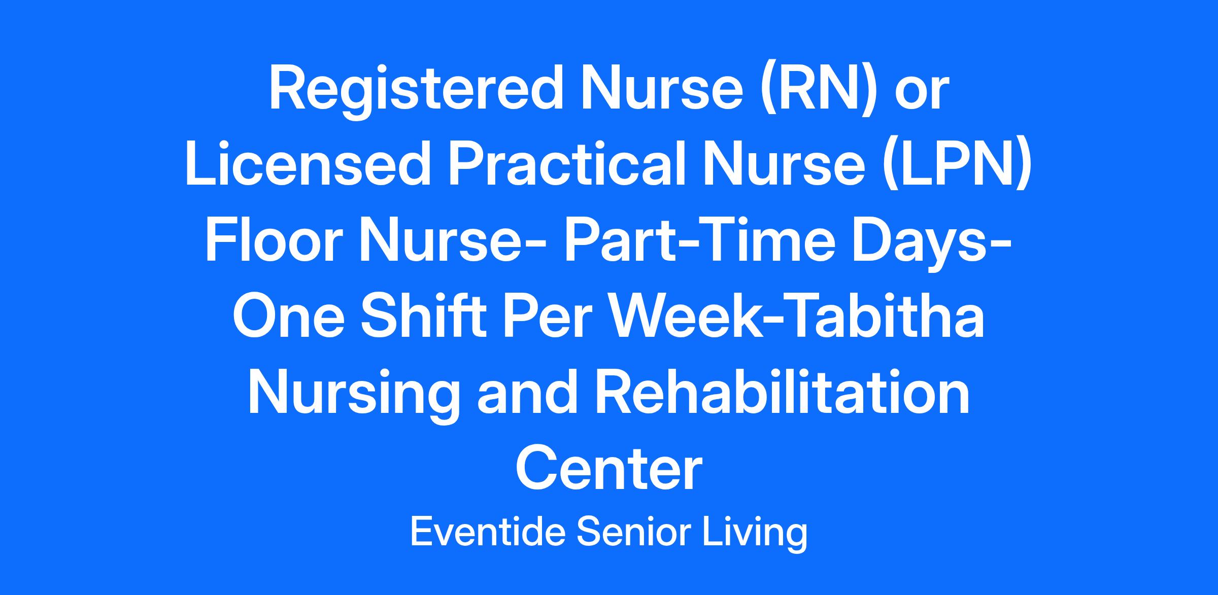 Eventide-Tabitha is currently hiring for a Part-Time Registered Nurse (RN) or Licensed Practical Nurse (LPN) Day shift 6a-6:30p (12 Hours). This position includes every third weekend and holiday rotation.