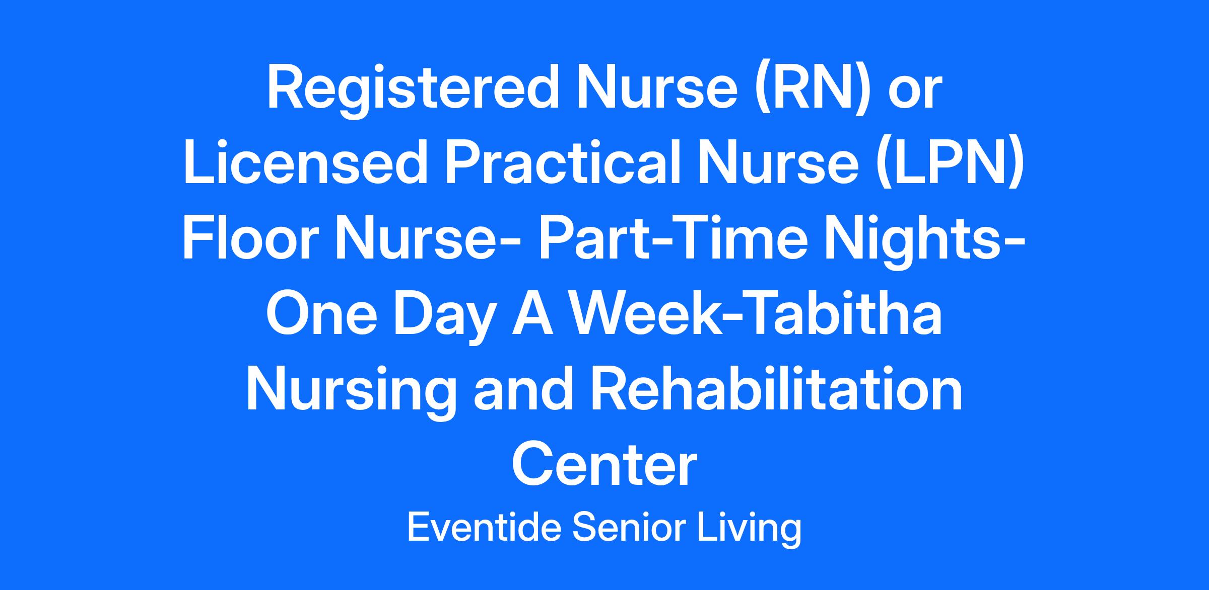 Eventide-Tabitha is currently hiring for a Full-Time Registered Nurse (RN) or Licensed Practical Nurse (LPN) for a Night shift 6p-6:30a (12 Hours). This position includes every third weekend and holiday rotation.