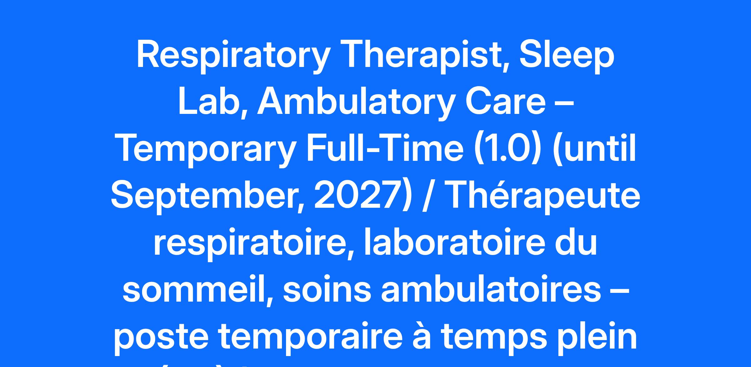 Compensation Pay Range: $41.85-$51.77 Job Description: Please Note: If you are a current CHEO employee with access to Workday, please apply to this posting via the Workday application as an internal applicant using the Jobs Hub. To successfully apply for this position, please submit your application by 11:59 pm the day before the advertised closing date in the posting to ensure your application is received. Ottawa is built on un-ceded Algonquin Anishinabek territory. The peoples of the Algonquin Anishinabek Nation have lived on this territory for millennia and we honour them and this land. Their culture and presence have nurtured and continue to nurture this land. CHEO also honours all First Nations, Inuit and Métis peoples and their valuable past and present contributions to this land. CHEO is one of the few stand-alone, global leaders in pediatric health and is home to more than 6,500 staff, clinicians, scientists and researchers, as well as volunteers – all of whom work together to help children and youth achieve their best lives. Within its own walls and through partnerships with community providers, CHEO has transformed from a 20th century acute care hospital into a 21st century integrated child and youth health system. Ranked in the top 1% of Canadian hospitals for the digitization of its clinical infrastructure, CHEO combines excellence in clinical care, research, and education to advance seamless care that’s provided where, when, and how it is needed. CHEO’s Research Institute is dedicated to world-class clinical, translational, and basic science research covering a wide range of children’s health concerns. CHEO has been named Canada’s best health-care employer by Forbes in 2024 and 2025 and is ranked second among Canadian hospitals on its list of Canada’s Best Employers for multiple consecutive years. For the 14th consecutive year in a row, the editors of Canada's Top 100 Employers has recognized CHEO as a top employer in the National Capital Region. Every year CHEO helps more than 500,000 children and youth from Eastern Ontario, western Quebec, Nunavut and Northern Ontario. POSITION SUMMARY The role of the respiratory therapist in the Ambulatory Care PSU involves responsibilities in the Sleep Lab . Responsibilities include: assessing, planning, implementing, evaluating and coordinating patient care for respiratory patients who are technology dependent and/or have sleep-disorder breathing. Please note that this position will be nights exclusively. The successful candidate will: Provides diagnostic testing including polysomnography Assess and titrate patients on both invasive and non-invasive mechanical ventilation Utilize clinical practice guidelines, clinical pathways, medical directives, hospital policies and procedures to promote and implement evidence based practice Implement respiratory care including patient assessment, oxygen therapy, airway management, ventilatory management, diagnostic testing and patient transport Utilize clinical practice guidelines, clinical pathways, medical directives, hospital policies and procedures to promote and implement evidence based practice Administer medication via inhalation as per medical directives or physician order Anticipate and prepare for emergencies Ensure safe and effective application of precise respiratory technological equipment to meet determined patient care goals Collaborate with other team members with the planning and organization of the sleep lab Provide patient and family support and education Participates in several interdisciplinary teams providing advice on respiratory management Contribute to the orientation and education of various members of the interdisciplinary team as appropriate Participate in quality assurance, research activities and workload measurement as appropriate Demonstrate a commitment to professional respiratory therapy practice Preceptor students from respiratory therapy educational programs QUALIFICATIONS Vulnerable Sector Check (Essential) Member of the College of Respiratory Therapy (General Certificate) (Essential) BCLS (Essential) Demonstrates strong interpersonal and collaborative practice skills (Essential) Demonstrates commitment to continuing education, including independent learning (Essential) Degree in Health Sciences or related field (Preferred) Member in good standing of the RTSO (Preferred) Member in good standing of the CRST (Preferred) PALS & and NRP certification (Preferred) Minimum 3 years pediatric respiratory care experience (Preferred) Experience in sleep laboratory (Preferred) Bilingualism (English/French) (Essential) Registered Polysomnographic Technologist (RPGST) or eligibility (Essential) Timeline may be extended or shortened based on operational needs * Please note you will be represented by the Ontario Public Service Employees Union (OPSEU). Please note that this position will be based out of Ottawa. Please note that location may be subject to change at any time at the discretion of the employer. All OPSEU members shall be granted an interview upon passing the pre-screening. Pre-screening might include testing. Effective March 29, 2021, CHEO will conduct a more comprehensive pre-screening and evaluation process. This process may include more varied and multidimensional testing such as a written test, practical exam, or other assessment. All candidates who meet the essential and preferred qualifications may be tested. Bilingualism (French/English) will be validated by a language proficiency assessment conducted by a third party provider. Candidates will be required to meet the minimum linguistic profile prior to the date of hire. Should you require accommodation during any phase in the recruitment process, please contact Human Resources at TalentAcquisition@cheo.on.ca. All information received in relation to accommodation will be kept confidential and will be handled in compliance with the Accessibility for Ontarians with Disabilities Act. CHEO is committed