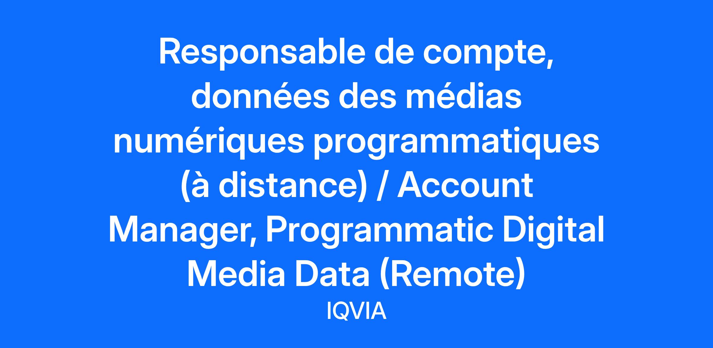 Responsable de compte, données des médias numériques programmatiques (à distance) Account Manager, IQVIA Digital (Remote) IQVIA est le leader du secteur en matière de solutions de données HCP (professionnels de santé), alimentant des campagnes numériques omnicanales. Nous proposons des solutions de données de pointe pour le ciblage programmatique, social, par e-mail et AdvancedTV. Grâce à des centaines de dimensions de données professionnelles, démographiques, organisationnelles, comportementales cliniques et de demandes de remboursement, ainsi qu'une base de contacts de plus de 10 millions de professionnels de santé (médecins, infirmiers praticiens, assistants médicaux, professionnels paramédicaux et pharmaciens jusqu’aux professionnels hospitaliers), nous offrons des solutions permettant le ciblage, l’engagement et la mesure numériques pour les agences, les laboratoires pharmaceutiques, les fabricants de dispositifs médicaux et les spécialistes du marketing en biotechnologie. En tant que membre de l’équipe IQVIA Digital, vous serez un contributeur clé au sein d’une ligne de produits en forte croissance chez IQVIA : les marchés programmatiques et sociaux pour les données de fournisseurs de soins de santé de premier plan. Ce poste est pratique et nécessite un bon mélange de connaissances techniques et commerciales, avec une forte implication client. Vous participerez à une large gamme d’activités commerciales, allant de la direction de réunions internes et clients, à la gestion des files de demandes, à l’amélioration des processus et à la collaboration avec diverses équipes internes pour garantir que les livrables clients soient prêts en temps voulu. En tant que membre du Centre d’Excellence pour l’Activation Digitale, vous trouverez un environnement de travail dynamique, collaboratif et agréable, où des personnes talentueuses mettent leurs compétences au service de produits et services innovants, dans le but d’assurer la satisfaction client. Fonctions essentielles du poste : Le candidat rejoindra une équipe qui maximise la valeur des produits pour nos clients et leurs programmes. Il sera principalement responsable de la gestion directe de nos partenaires de canal engagés dans des programmes programmatiques et sociaux pour des comptes clés. Le succès du candidat sera mesuré par le niveau de satisfaction client et sa capacité à atteindre les indicateurs clés du produit : Gérer la relation globale produit et livrables avec les clients assignés à forte valeur, ce qui inclut : accroître l’adoption, assurer la rétention et la satisfaction. Générer des revenus à partir de relations directes avec les clients et/ou en collaboration avec leurs agences. Établir une relation de conseiller stratégique/de confiance avec chaque client assigné et générer une valeur continue à partir de nos produits. Diagnostiquer et anticiper les besoins des clients, concevoir des solutions potentielles, démontrer la valeur du produit et assurer le suivi pour garantir le succès client. Comprendre les besoins de ciblage des clients, générer des fichiers de cibles, les charger dans les plateformes de destination et fournir des correspondances en ligne et hors ligne. Assurer la conformité totale aux directives de la FDA Pharma (le cas échéant). Collaborer avec les équipes commerciales et opérationnelles pour identifier et développer des opportunités de vente additionnelle et de solutions personnalisées. Défendre les besoins et problèmes des clients auprès des équipes Produit et Technologie. Travailler avec l’équipe de gestion produit pour définir les exigences des produits et des rapports, nouveaux et existants. Aider à la création de propositions, contrats, réponses aux appels d’offres et autres documents pour générer des revenus supplémentaires. Participer à la formation des employés juniors sur les outils et processus. Être à l’aise pour travailler de manière autonome. Continuer à développer activement ses connaissances du paysage programmatique et des médias sociaux. Qualifications : Pour réussir dans ce poste, le candidat doit faire preuve de passion et de collaboration. Les exigences ci-dessous représentent les connaissances, compétences et aptitudes requises. Le candidat idéal aura une excellente expérience en AdTech, incluant le marketing programmatique et social, la gestion technique de produit en relation client, la gestion technique de comptes, et une expérience client démontrée avec un historique d’augmentation de la satisfaction, de l’adoption et de la rétention. Vous serez amené à travailler sur des produits et/ou services pour des clients IQVIA au Canada et à l’international, une maîtrise fonctionnelle de l’anglais écrit et parlé est donc nécessaire. Diplôme universitaire en communication, marketing, gestion de comptes ou informatique. 4 à 5 ans d’expérience pratique dans la gestion de campagnes programmatiques en agence, chez un onboarder, sur une plateforme de gestion ou API publicitaire sociale, ou DSP. Expérience préalable en planification média numérique (minimum 2 ans). Connaissance du secteur du marketing numérique médical/pharmaceutique. Expertise du paysage programmatique global, achat programmatique (DSP) et segmentation d’audience (DMP). Expérience démontrée en display, vidéo, social et/ou partenaires DSP, ainsi qu’avec des fournisseurs de données ou médias externes (DV 360, TTD, MediaMath, LiveRamp, etc.). Expérience dans l’extraction et l’analyse de données de reporting de campagnes, et capacité à formuler des recommandations aux équipes internes. Connaissance des réglementations CAN-SPAM, CASL, CCPA, RGPD et autres normes liées aux communications marketing. Compétences en gestion du temps : organiser et prioriser efficacement, respecter les délais et livrer les résultats attendus. Expérience dans la création de docum