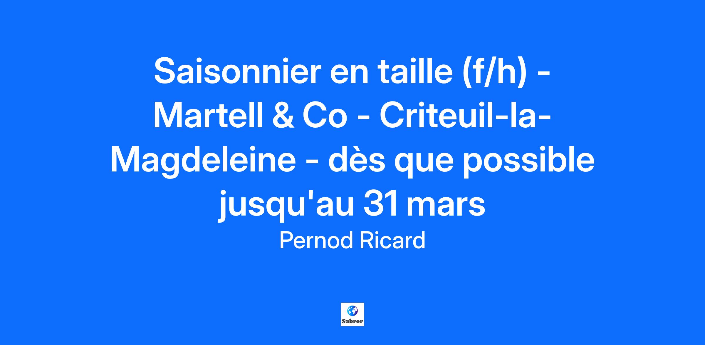Les Domaines de Martell, exploitant plus de 450 hectares répartis sur plusieurs crus et engagés dans une viticulture durable certifiée (ISO 9001, OHSAS 18001, ISO 14001, HVE3), recrutent un(e) saisonnier(e) ouvrier(ère) viticole pour renforcer l’équipe dès que possible. Vos missions Vous intégrerez une équipe confirmée et participerez aux travaux d’hiver : Taille Tirage de bois Attachage Entretien des parcelles Votre profil Obligatoirement une saison complète de taille déjà effectuée Autonomie, rigueur, esprit d’équipe Conditions de travail Horaires : Janvier : 8h15–17h15, Février : 8h30–17h, Mars : 7h45–16h45 Vendredi après-midi libre Contrat Début : dès que possible Fin : 31 mars, avec possibilité de prolongation jusqu’à fin juin (égourmandage, relevage) Rémunération et avantages 13,56 €/h + 13ᵉ mois Indemnités selon jours travaillés : Panier : 0,99 € soumis + 7,40 € non soumis/jour + Salissure : 0,52 €/jour + Déplacement : 3,28 €/jour Job Posting End Date: Target Hire Date: 2025-12-15 Target End Date: 2026-06-30 Pernod Ricard is a worldwide leader in the spirits industry, with consolidated sales of €11.6 Billion in 2024, blending traditional craftsmanship, state-of-the-art brand development, and global distribution technologies. Our comprehensive portfolio of premium brands includes Absolut vodka, Ricard pastis, Ballantine’s, Chivas Regal, Royal Salute, and The Glenlivet Scotch whiskies, Jameson Irish whiskey, Martell cognac, Havana Club rum, Beefeater gin, Malibu liqueur and Mumm and Perrier-Jouët champagnes. We are a business with a soul: a company with family values, deeply rooted in our terroirs and legacy. We drive the long-term growth of our brands with full respect for people and the environment, while empowering our 19,500+ employees around the world to be ambassadors of our purposeful, inclusive and responsible culture of authentic conviviality. Our shared purpose, mission, ambition and culture define who we are and drive our collective success.