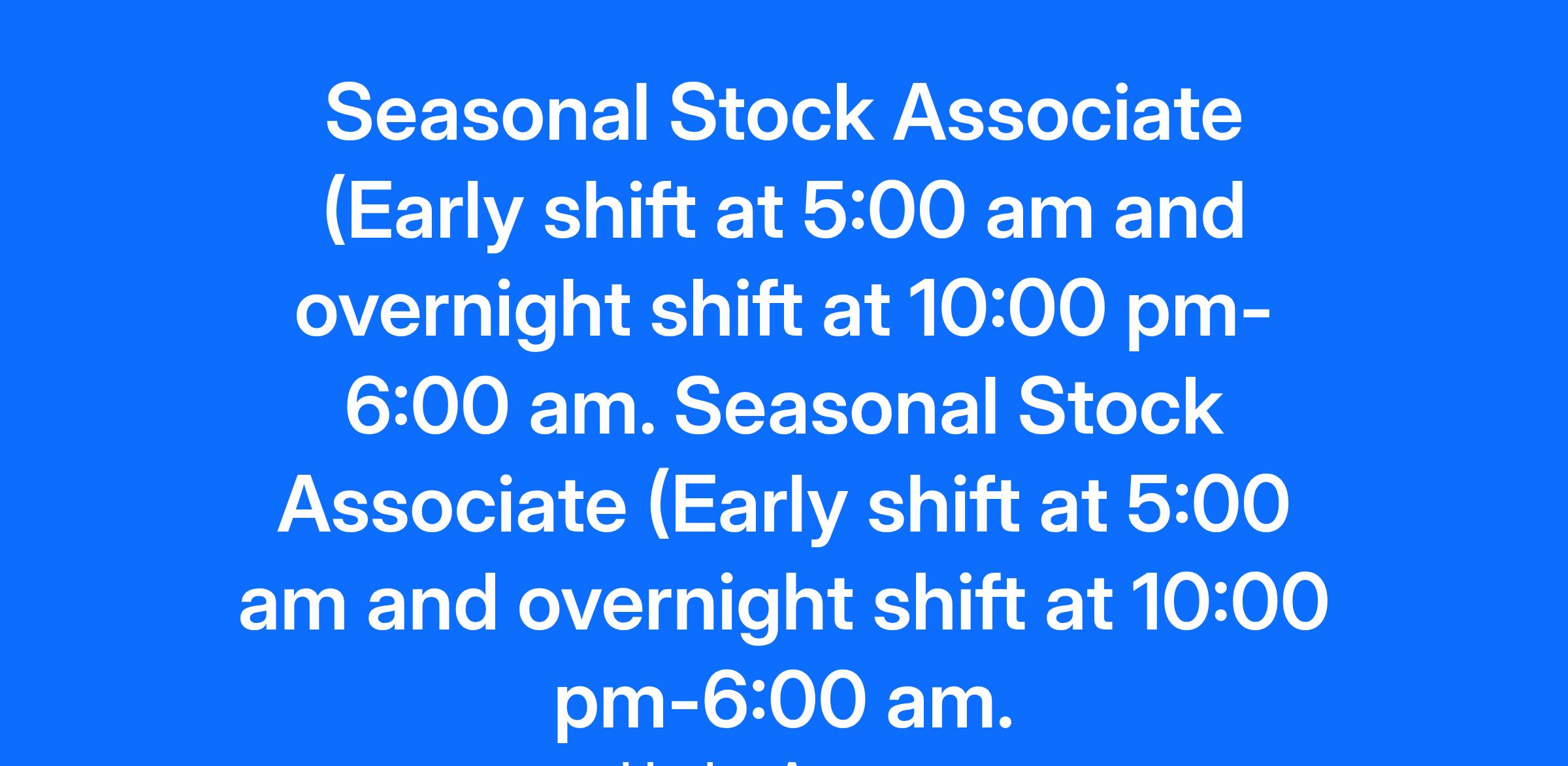 Seasonal Stock Associate (Early shift at 5:00 am and overnight shift at 10:00 pm-6:00 am. Seasonal Stock Associate (Early shift at 5:00 am and overnight shift at 10:00 pm-6:00 am.