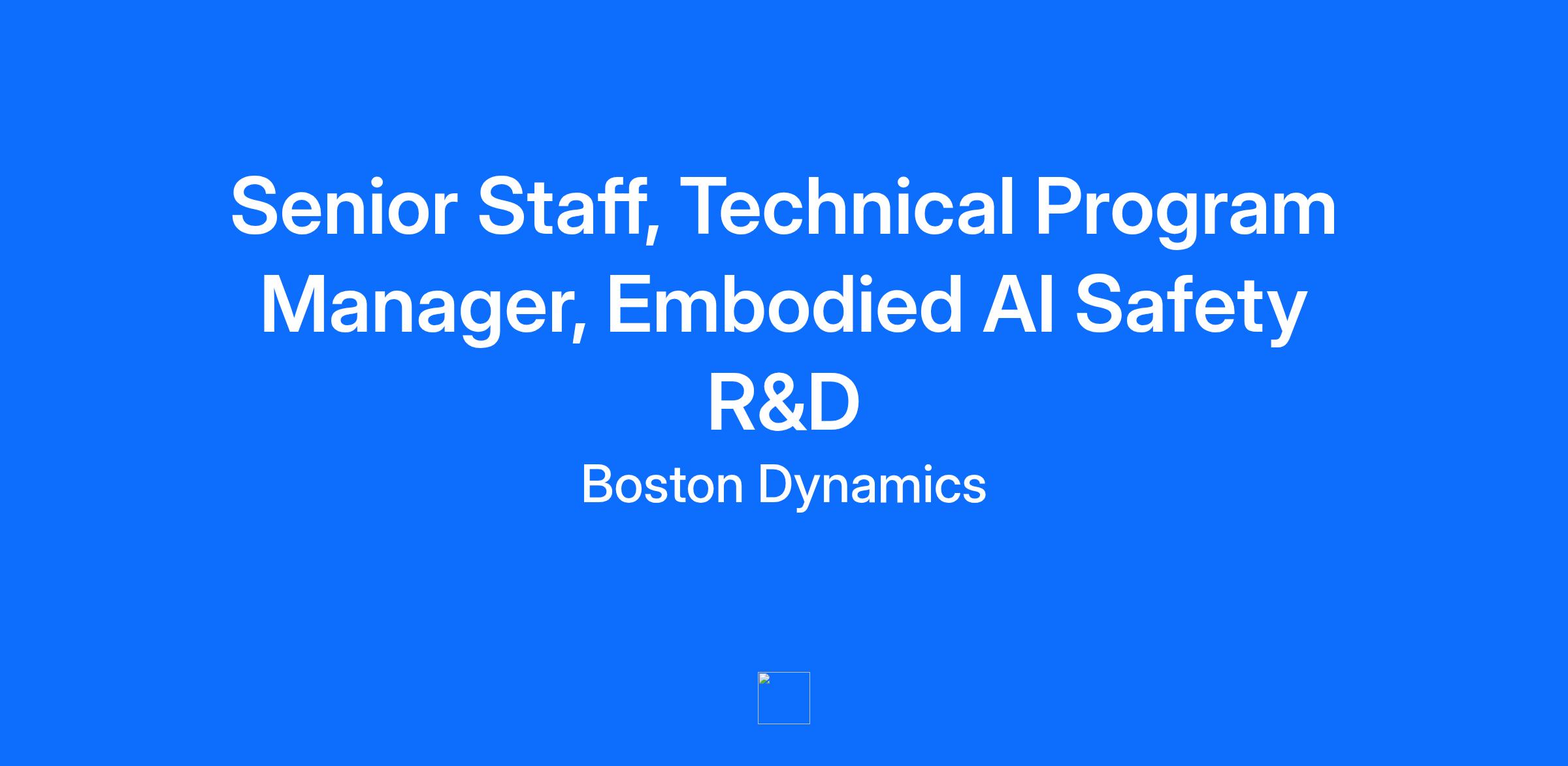 Technical Program Manager - Embodied AI Safety R&D As a Technical Program Manager on the Embodied AI Safety R&D Team, you will help coordinate and lead the cross-functional development of new technologies supporting the expansion of Boston Dynamics robots into new applications and environments. Every day, you will work to collaborate closely with researchers, engineers, and functional managers that are building embodied AI/ML systems that will help our robots operate safely near people. You will help chart a course for a future where humans and robots can coexist in complex spaces. This role is a unique opportunity to be a part of the development of the next generation of Boston Dynamics robots. Boston Dynamics is a world leader in mobile robots, tackling some of the toughest robotics challenges. In this role you will work to create novel solutions to one of the most important problems in robotics. If you are creative, thrive in a small team environment, and passionate about a world where humans and robots truly work together - come join us! How you will make an impact: Coordinate with other program managers to deliver your program into next-gen robotic products Partner with functional managers to develop and manage processes for the development of safety-relevant software, perception systems, and AI/ML systems Work with functional leads to establish goals, a plan, and a schedule, tracking performance against that plan Communicate regularly on status, schedule, risks, and deviations Coordinate with stakeholders to define project scope, objectives, and deliverables Use resource planning to identify bottlenecks, unblock them, and adjust schedules accordingly Continually track projects and update stakeholders on top priorities and the critical path Proactively identify and mitigate risks to program delivery, and implement effective contingency plans when necessary Be a champion for effectively scaling embodied AI safety We are looking for: Bachelor’s degree in software engineering, robotics, or a related field 7+ years of experience working in large-scale software, robotics, and/or machine learning development environments 5+ years of program management experience in a professional and product-driven software development environment Experience with safety-relevant AI/ML processes (e.g. autonomous vehicles) is a nice-to-have Excellent organizational and time management skills Excellent verbal and written communication skills Proficiency in project management software and skills (e.g. JIRA, SmartSheet) Strong problem-solving skills and the ability to handle multiple tasks simultaneously We are interested in every qualified candidate who is eligible to work in the United States. However, we are not able to sponsor visas for this position. The pay range for this position is between $151,284 to $208,015 annually. Base pay will depend on multiple individualized factors including, but not limited to internal equity, job related knowledge, skills and experience. This range represents a good faith estimate of compensation at the time of posting. Boston Dynamics offers a generous Benefits package including medical, dental vision, 401(k), paid time off and a annual bonus structure. Additional details regarding these benefit plans will be provided if an employee receives an offer for employment. We are growing rapidly, building a commercial company that delivers cutting edge technology and solutions to our customers from industrial applications to logistics and warehouse solutions.