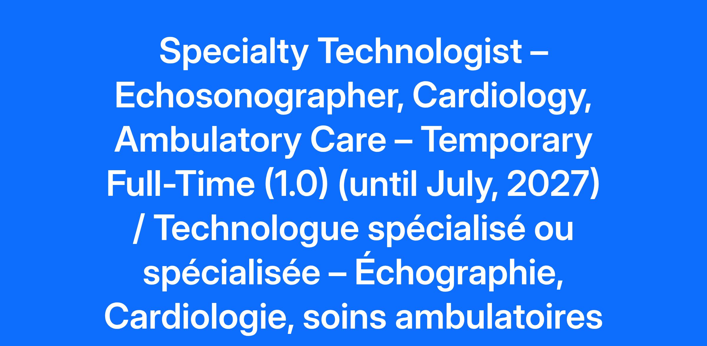 Compensation Pay Range: $41.85-$51.77 Job Description: Please Note: If you are a current CHEO employee with access to Workday, please apply to this posting via the Workday application as an internal applicant using the Jobs Hub. To successfully apply for this position, please submit your application by 11:59 pm the day before the advertised closing date in the posting to ensure your application is received. Ottawa is built on un-ceded Algonquin Anishinabek territory. The peoples of the Algonquin Anishinabek Nation have lived on this territory for millennia and we honour them and this land. Their culture and presence have nurtured and continue to nurture this land. CHEO also honours all First Nations, Inuit and Métis peoples and their valuable past and present contributions to this land. CHEO is one of the few stand-alone, global leaders in pediatric health and is home to more than 6,500 staff, clinicians, scientists and researchers, as well as volunteers – all of whom work together to help children and youth achieve their best lives. Within its own walls and through partnerships with community providers, CHEO has transformed from a 20th century acute care hospital into a 21st century integrated child and youth health system. Ranked in the top 1% of Canadian hospitals for the digitization of its clinical infrastructure, CHEO combines excellence in clinical care, research, and education to advance seamless care that’s provided where, when, and how it is needed. CHEO’s Research Institute is dedicated to world-class clinical, translational, and basic science research covering a wide range of children’s health concerns. CHEO has been named Canada’s best health-care employer by Forbes in 2024 and 2025 and is ranked second among Canadian hospitals on its list of Canada’s Best Employers for multiple consecutive years. For the 14th consecutive year in a row, the editors of Canada's Top 100 Employers has recognized CHEO as a top employer in the National Capital Region. Every year CHEO helps more than 500,000 children and youth from Eastern Ontario, western Quebec, Nunavut and Northern Ontario. POSITION SUMMARY The successful incumbent will: Perform cardiac ultrasound studies including portable studies off-unit Operate complex ultrasound equipment with a complete understanding of the physical principles of the ultrasound and its bio-effects Consult with referring Cardiologists regarding the appropriate ultrasound procedure Assess and prepare patients for procedures; continuously assessing their condition throughout the procedure Obtain images and recognize abnormalities and correlate information with clinical patient data Perform 2-dimensional, m-mode, color and spectral Doppler flow studies selecting relevant echocardiographic data; making calculations to obtain diagnostic information Collate 2-dimensional image information obtained on an on-going basis throughout the study, create a 3-dimensional model and uses this to obtain optimal image and physiological information which is then given to a cardiologist Provide written sonographer preliminary technical impressions within PACs system (picture archiving and communication system) Assist, supervise and teach technical skills to students in training and sonographers, depending on level of expertise Input study information into digital echo system Engage in professional development activities and keep up-to-date in the field of ultrasound and pediatric cardiology Establish and maintain good working relations and rapport with all members of the health care team, patients and families QUALIFICATIONS Police Record Check (PRC) (Essential) Current registration with the ARDMS (Essential) Active member of CSDMS (Essential) Current registration in BCLS (Preferred) Two (2) years of clinical experience in scanning, preferably in Pediatric Echocardiography (Essential) Fetal Echo experience (Preferred) Detailed knowledge of normal cardiovascular anatomy and physiology and knowledge of congenital cardiac defects (Essential) Ability to work autonomously, as well as within a multidisciplinary team (Essential) Demonstrated strong math, communication and problem solving skills (Essential) Computer literacy and data entry skills (Essential) Bilingual (French/English) (Essential) Timeline may be extended or shortened based on operational needs * Please note you will be represented by the Ontario Public Service Employees Union (OPSEU). Please note that this position will be based out of Ottawa. Please note that location may be subject to change at any time at the discretion of the employer. All OPSEU members shall be granted an interview upon passing the pre-screening. Pre-screening might include testing. Effective March 29, 2021, CHEO will conduct a more comprehensive pre-screening and evaluation process. This process may include more varied and multidimensional testing such as a written test, practical exam, or other assessment. All candidates who meet the essential and preferred qualifications may be tested. Bilingualism (French/English) will be validated by a language proficiency assessment conducted by a third party provider. Candidates will be required to meet the minimum linguistic profile prior to the date of hire. Should you require accommodation during any phase in the recruitment process, please contact Human Resources at TalentAcquisition@cheo.on.ca. All information received in relation to accommodation will be kept confidential and will be handled in compliance with the Accessibility for Ontarians with Disabilities Act. CHEO is committed to providing a safe environment for staff, patients, and visitors. Consistent with that commitment, all applicants must be fully vaccinated against COVID-19 to be considered for any staff or volunteer opportunities. Applicants are also strongly encouraged to receive their COVID-19 booster shots when eligible to protect against the spread of COVID-19. Upon hiring, presentation of government issued documentation