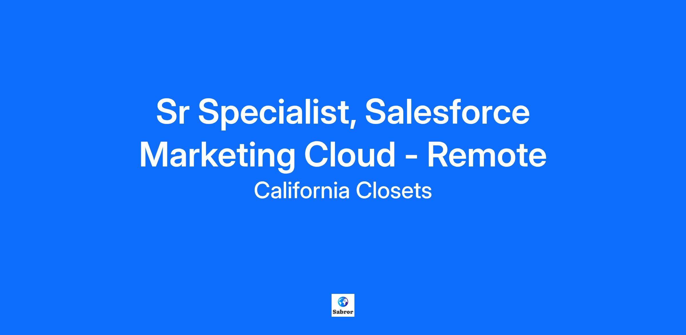 We foster a values-based, collaborative environment and are seeking candidates who know how to drive growth while building deep partnerships. As a key driver of California Closets’ growth, this role works in partnership with cross-functional teams, and drives the results for a high-impact, high-visibility marketing channel, offering significant opportunities to make a meaningful impact on meeting our business objectives. The Senior Salesforce Marketing Cloud Specialist will report to the Senior Director, Relationship Marketing (CRM).