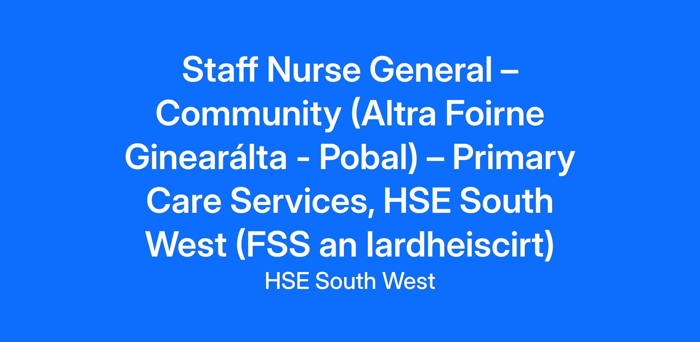 The Staff Nurse General (Community) works as part of the community based team alongside Public Health Nurses and Community Registered General Nurses. Staff work as lone workers providing nursing care to clients in Health Centres/Primary Care Centres and in the client’s home. Staff will assess, plan, implement and evaluate care to the highest professional and ethical standards within the model of nursing care practiced in the community setting. The Staff Nurse will work as part of the Community Intervention Team (Kerry) in the patient’s home, CIT Kerry Clinic and in both public and private nursing homes.