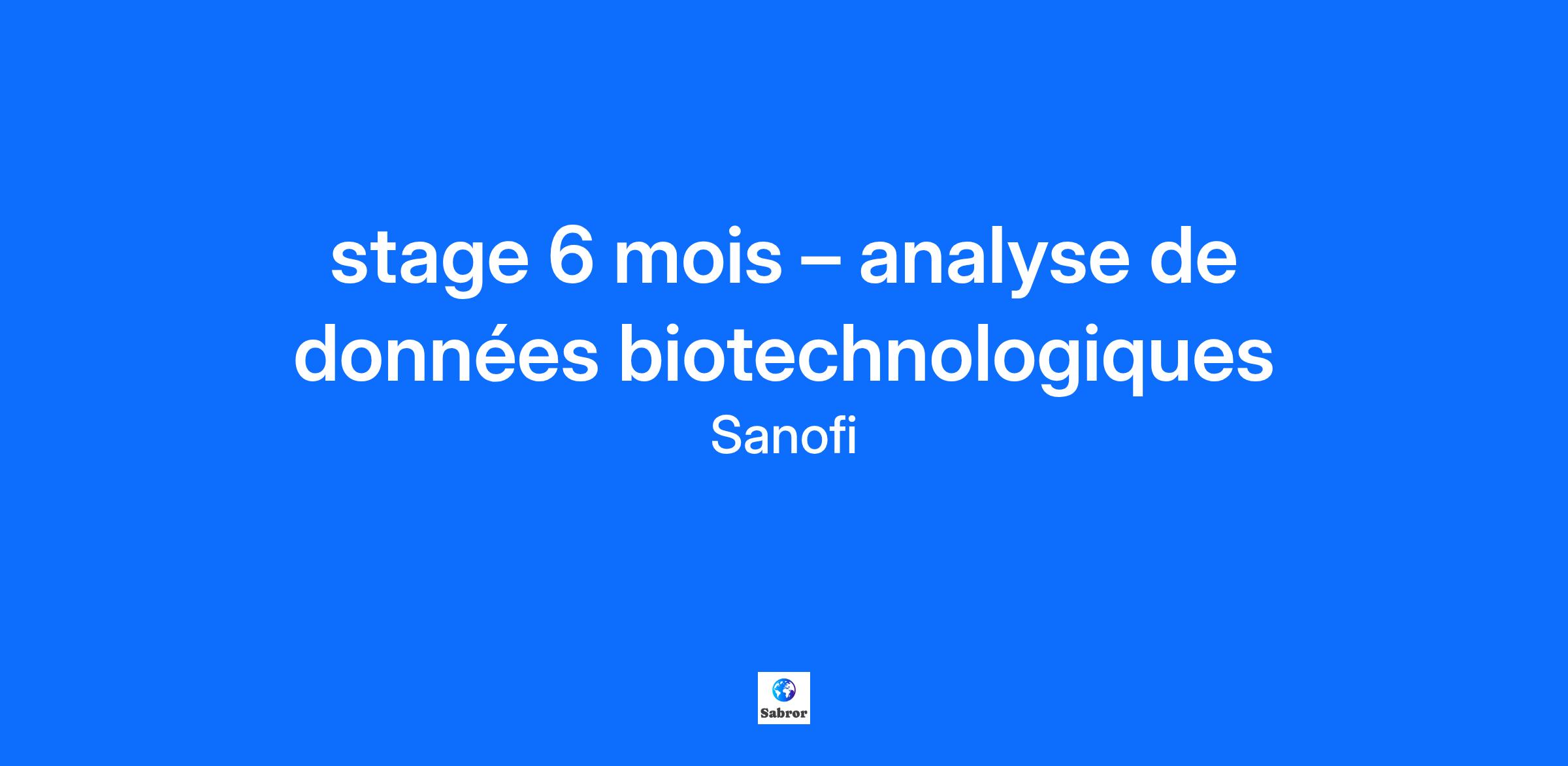 Intitulé du poste : stage 6 mois – analyse de données biotechnologiques Lieu : Vitry-sur-Seine A partir de : février 2026 À propos du poste En tant que stagiaire analyse de données biotechnologiques au sein de notre équipe développement analytique, vous allez participer à l’analyse de données analytiques à la suite de la digitalisation du laboratoire. Prêt à commencer ? Prêt(e) à développer tes compétences tout en participant à l’avenir de la santé ? Chez Sanofi, tu auras la liberté d’apprendre, de poser des questions et de donner vie à tes idées, le tout soutenu par des mentors inspirants et des équipes collaboratives. À propos de Sanofi : Sanofi est une entreprise biopharmaceutique qui innove en R&D et exploite l'IA à grande échelle pour améliorer la vie des gens et créer de la croissance à long terme. Notre compréhension approfondie du système immunitaire – et notre pipeline innovant – nous permet d’inventer des médicaments et des vaccins qui traitent et protègent des millions de personnes dans le monde entier. Ensemble, nous poursuivons les miracles de la science pour améliorer la vie des gens. Principales responsabilités : Collaborer à la communication entre les systèmes informatisés du laboratoire Apporter votre support à la réalisation de rapports de tendance analytiques à partir de bases de données Participer à l’élaboration de documents pour l’automatisation de protocoles et des rapports analytiques À propos de vous Compétences techniques et relationnelles : rigueur, qualités rédactionnelles, autonomie. Connaissances en analyse de procédés biotechnologiques, gestion de données analytiques, outils digitaux Éducation : bac+5 en biotechnologies, digital Langues : anglais intermédiaire Pourquoi nous choisir ? Lance ta carrière dans une entreprise qui investit en toi, et te donne les moyens de réinventer ce qui est possible. Construis ton avenir avec les outils les plus récents, l’innovation digitale et un apprentissage continu pour toujours garder une longueur d’avance. Évolue dans une entreprise engagée où ta voix compte et où ton travail améliore la vie de millions de personnes. Épanouis-toi dans des environnements inclusifs et flexibles qui soutiennent ton bien-être personnel et professionnel. Une gratification de stage attractive. Selon votre site de rattachement, l’accès à un restaurant d’entreprise avec une participation de Sanofi. Notre processus de recrutement a été pensé pour être rapide et efficace. Si votre candidature est retenue, vous recevrez un appel de notre recruteur.se pour un premier échange téléphonique puis pour rencontrer rapidement le ou la manager. Toujours Progresser. Découvrir l’Extraordinaire. Rejoignez Sanofi et entrez dans une nouvelle ère de la science – où votre parcours peut être aussi transformateur que le travail que nous accomplissons. Nous investissons en vous pour que vous alliez plus loin, accélériez votre réflexion et accomplissiez ce qui n’a jamais été fait auparavant. Vous contribuerez à repousser les limites, à bousculer les conventions et à concevoir des solutions plus intelligentes pour les communautés que nous servons. Prêt·e à poursuivre les miracles de la science et à améliorer la vie des gens ? Poursuivons le progrès et découvrons l’extraordinaire – ensemble. Chez Sanofi, nous croyons dans l’égalité des chances, sans distinction de race, de couleur, d’ascendance, de religion, de sexe, d’origine, d’orientation sexuelle, d’âge, de citoyenneté, d’état civil, de handicap, d’identité de genre ou de tout autre critère protégé par la loi. Pursue progress, discover extraordinary Better is out there. Better medications, better outcomes, better science. But progress doesn’t happen without people – people from different backgrounds, in different locations, doing different roles, all united by one thing: a desire to make miracles happen. So, let’s be those people. At Sanofi, we provide equal opportunities to all regardless of race, colour, ancestry, religion, sex, national origin, sexual orientation, age, citizenship, marital status, ability or gender identity. Watch our ALL IN video and check out our Diversity Equity and Inclusion actions at sanofi.com! Global Terms & Conditions and Data Privacy Statement Sanofi is dedicated to supporting people through their health challenges. We are a global biopharmaceutical company focused on human health. We prevent illness with vaccines, provide innovative treatments to fight pain and ease suffering. We stand by the few who suffer from rare diseases and the millions with long-term chronic conditions. With more than 100,000 people in 100 countries, Sanofi is transforming scientific innovation into healthcare solutions around the globe. Discover more about us visiting www.sanofi.com or via our movie We are Sanofi As an organization, we change the practice of medicine; reinvent the way we work; and enable people to be their best versions in career and life. We are constantly moving and growing, making sure our people grow with us. Our working environment helps us build a dynamic and inclusive workplace operating on trust and respect and allows employees to live the life they want to live. All in for Diversity, Equity and Inclusion at Sanofi - YouTube