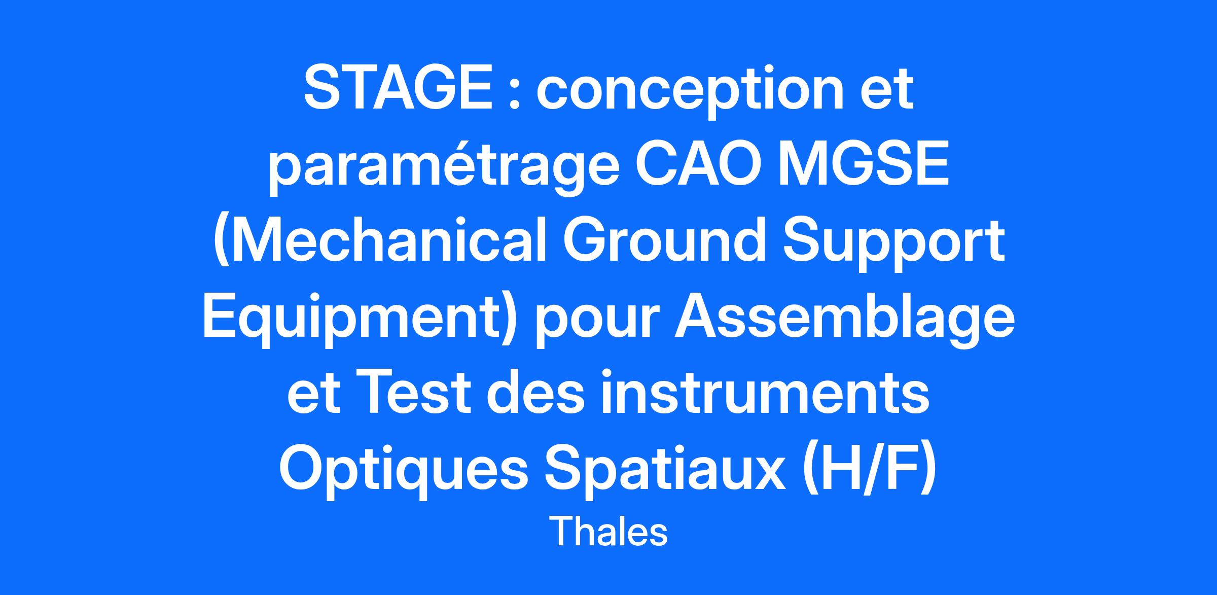 Lieu : Cannes, France Construisons ensemble un avenir de confiance Thales est un leader mondial des hautes technologies spécialisé dans trois secteurs d’activité : Défense & Sécurité, Aéronautique & Spatial, et Cyber & Digital. Il développe des produits et solutions qui contribuent à un monde plus sûr, plus respectueux de l’environnement et plus inclusif. Le Groupe investit près de 4 milliards d’euros par an en Recherche & Développement, notamment dans des domaines clés de l’innovation tels que l’IA, la cybersécurité, le quantique, les technologies du cloud et la 6G. Thales compte près de 81 000 collaborateurs dans 68 pays. Nos engagements, vos avantages Notre savoir-faire technologique Notre attention portée à l’équilibre des collaborateurs Un environnement inclusif et bienveillant Un engagement sociétal et environnemental reconnu (Thales Solidarity, indice CAC 40 ESG…) Votre quotidien Le site de Cannes est en charge de la conception des systèmes satellitaires & plateformes, de l’assemblage/intégration/test des satellites ainsi que des opérations en orbite. Le site a une expertise en instrumentation optique et en avionique. Sur le site de Cannes, au sein de la Direction Observation, Sciences et Exploration, vous intégrerez le Département Ingénierie Satellite constitué d’une centaine d’ingénieurs et de techniciens travaillant sur la conception et définition de Satellite ou d’Instrument Scientifiques (Observation de la Terre, Observation de l’Univers) Vos principales missions seront les suivantes : Réaliser la conception et le paramétrage de MGSE (Outillages / Mechanical Ground Support Equipment) génériques sous CATIA V5 des bâtis de vibration et des échangeurs thermiques équipements des charges utiles optique. Pour la conception des bâtis de vibration, le paramétrage définira les dimensions des bâtis (type plaque) et les interfaces des tables des pots vibrants, en réponse à des besoins de tenue mécanique. Pour la conception des échangeurs, le paramétrage définira, les dimensions des plaques, les transitions et les structures internes à flux non laminaires, en réponse à des besoins de performances thermiques et découlement fluidique. Rédiger en parallèle d’une note explicative pour l’équipe MGSE DOS pour les paramétrages de la Conception Assistée par Ordinateur Votre profil Stage – Ingénieur informatique – (H/F) Conception et déploiement d’un système informatique pour l’observation de satellites. Votre priorité est de rejoindre un groupe spatial innovant ? Vous avez l’ambition de valoriser vos acquis académiques en environnement industriel et développer de nouvelles compétences ? Issu d’une formation de niveau BAC+2 engagé dans un cursus à dominante conception mécanique, vous recherchez un stage d’une durée de 2 mois ? Vous maîtrisez la Conception Assistée par l’Ordinateur sous CATIA V5 ? Vous avez des fortes notions de fabrication (usinage, impression 3D métallique) ? Vous avez des compétences significatives en dimensionnement mécanique ? Idéalement, vous avez des notions sur les échanges thermiques, définition et mise en plan ? Esprit d’initiative, sens de l’organisation, curiosité scientifique, sens du service et de la communication sont des atouts que l'on vous reconnait ? Alors ce poste est fait pour vous ! Le mot de l’équipe Rejoignez notre équipe et mettez en pratique vos connaissance théoriques. Vous serez en interface avec notre équipe expérimentée et passionnée pour vous accompagner. Tous nos stages sont conventionnés et soumis à une gratification dont le montant est déterminé selon votre niveau d’études. Thales, entreprise Handi-Engagée, reconnait tous les talents. La diversité est notre meilleur atout. Postulez et rejoignez nous ! Interested in a CAREER IN THE RAIL transportation sector? To see our jobs in the railway market, please visit our dedicated site here