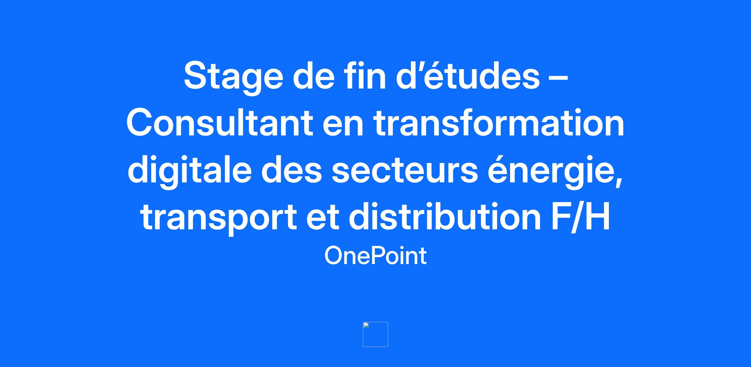 Au sein d'un collectif de 400 personnes, accompagné.e par des consultant.es expérimenté.es vous avez l'opportunité d'intervenir sur des projets de transformation digitale dans le secteur de l’énergie, du transport, de la distribution ou du luxe, sur l'une des expertises suivantes : La gestion de projet L'amélioration de la performance et des process Le Product Management En fin de cursus d'une école de commerce, d'ingénieur ou d'un IEP de premier rang, vous avez démontré un intérêt dans votre parcours pour le conseil en management : Une première expérience en conseil, dans le cadre d’un stage, de missions en startup ou en junior entreprise, sera appréciée. Vous avez développé une culture technologique forte et une compréhension des différents enjeux liés à la transformation digitale. Vous avez une appétence pour l’un des secteurs suivants et souhaitez y intervenir prioritairement en mission : énergies et utilities, transport, distribution, luxe. Au cours de votre cursus académique et dans le cadre de vos expériences vous avez développé : Un excellent relationnel avec de très bonnes capacités de communication orale et écrite, capable de mobiliser avec intelligence des équipes fortement sollicitées sur leurs projets. Un excellent esprit de synthèse, d'analyse et une capacité à prendre du recul. Un état d’esprit entreprenant vous permettant de proposer des solutions innovantes. Une excellente maitrise de Powerpoint et un sens de l'esthétisme Une aisance professionnelle en anglais. Processus de recrutement Un processus de recrutement établi en fonction de vos compétences et de vos expériences. Selon votre profil, nous vous proposons de démontrer concrètement vos savoir-faire qu’ils soient tech, métier, créa ou méthodologique…) As an architect of major transformations for companies and public sector players, Onepoint is building a direction and outlining future prospects in an uncertain world, by putting technological innovation at the service of its customers' and society's progress.