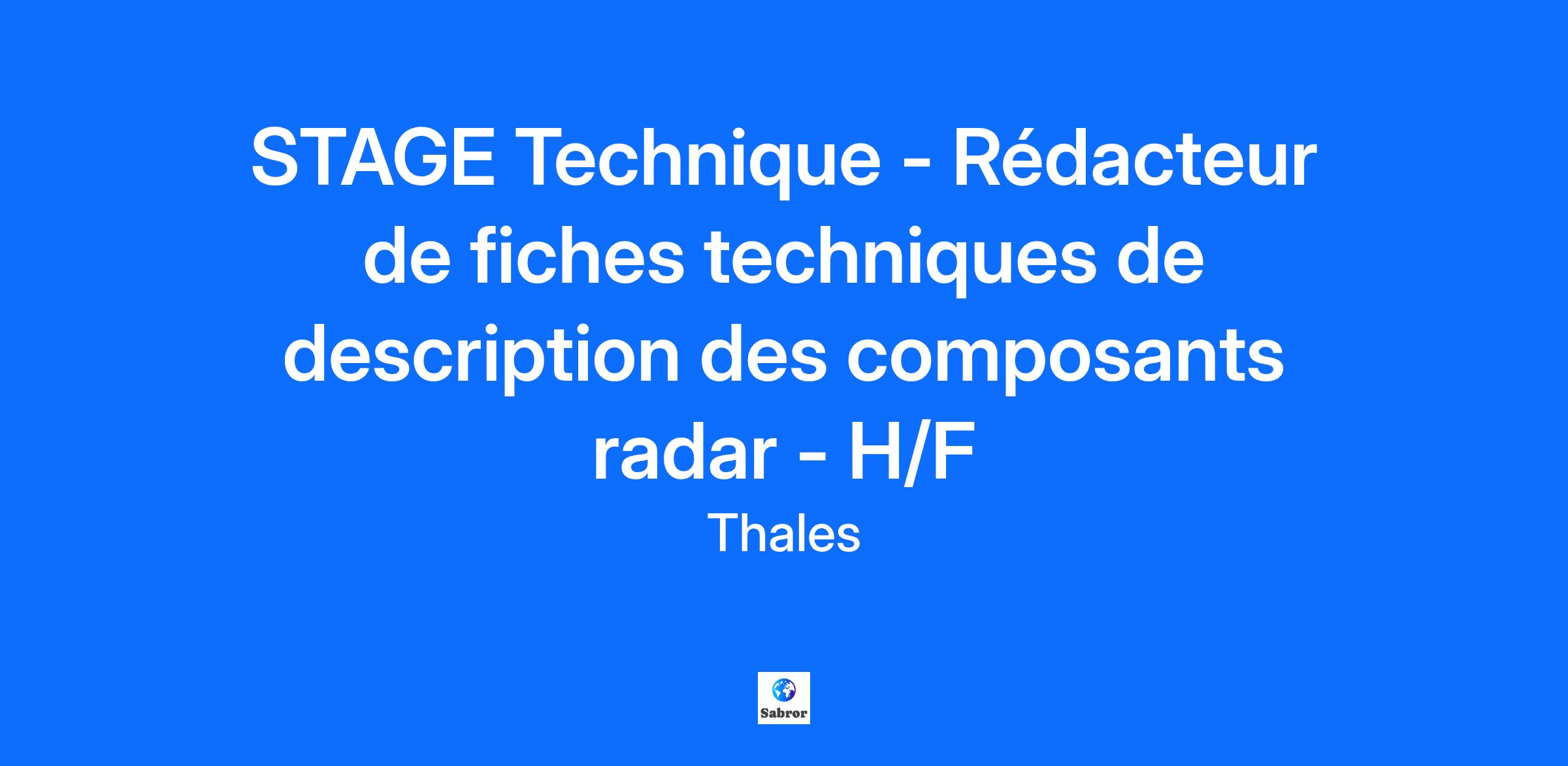 Lieu : Rouen, France Construisons ensemble un avenir de confiance Thales est un leader mondial des hautes technologies spécialisé dans trois secteurs d’activité : Défense & Sécurité, Aéronautique & Spatial, et Cyber & Digital. Il développe des produits et solutions qui contribuent à un monde plus sûr, plus respectueux de l’environnement et plus inclusif. Le Groupe investit près de 4 milliards d’euros par an en Recherche & Développement, notamment dans des domaines clés de l’innovation tels que l’IA, la cybersécurité, le quantique, les technologies du cloud et la 6G. Thales compte près de 81 000 collaborateurs dans 68 pays. Nos engagements, vos avantages Notre savoir-faire technologique Notre attention portée à l’équilibre des collaborateurs Un environnement inclusif et bienveillant Un engagement sociétal et environnemental reconnu (Thales Solidarity, indice CAC 40 ESG…) Votre quotidien Notre site, proche de Rouen, se démarque grâce à nos équipes de conception visionnaires, d'intégration et d'installation pour les radars civils. Nous repoussons les limites avec des sous-ensembles hyperfréquences de pointe, spécialement conçus pour le domaine militaire. Ce stage s’inscrit dans le but d’enrichir un catalogue de fiches techniques décrivant les sous-ensembles de nos radars de surveillance aérienne d’anciennes et de dernière générations. Dans cet optique, les objectifs du stage seront : 1- Recueillir les besoins pour définir le formalisme des fiches et les informations à y inclure, 2- Apprendre à utiliser les outils de gestion de configuration contenant les données techniques, 3- Collecter et s’approprier les données techniques issues des dossiers de définition, 4- Rédiger les fiches techniques Votre profil Vous préparez une Formation de niveau Bac/+2 dans le domaine du data management/ gestion de configuration. Vous avez une appétence pour le monde de l’industrie et notamment un attrait pour les sujets techniques. Vous disposez d’une bonne capacité de rédaction ainsi qu’une bonne capacité de synthèse. Vous êtes motivé, curieux et rigoureux. Alors ce poste est fait pour vous ! Tous nos stages sont conventionnés et soumis à une gratification dont le montant est déterminé selon votre niveau d’études. Thales, entreprise Handi-Engagée, reconnait tous les talents. La diversité est notre meilleur atout. Postulez et rejoignez nous ! Interested in a CAREER IN THE RAIL transportation sector? To see our jobs in the railway market, please visit our dedicated site here
