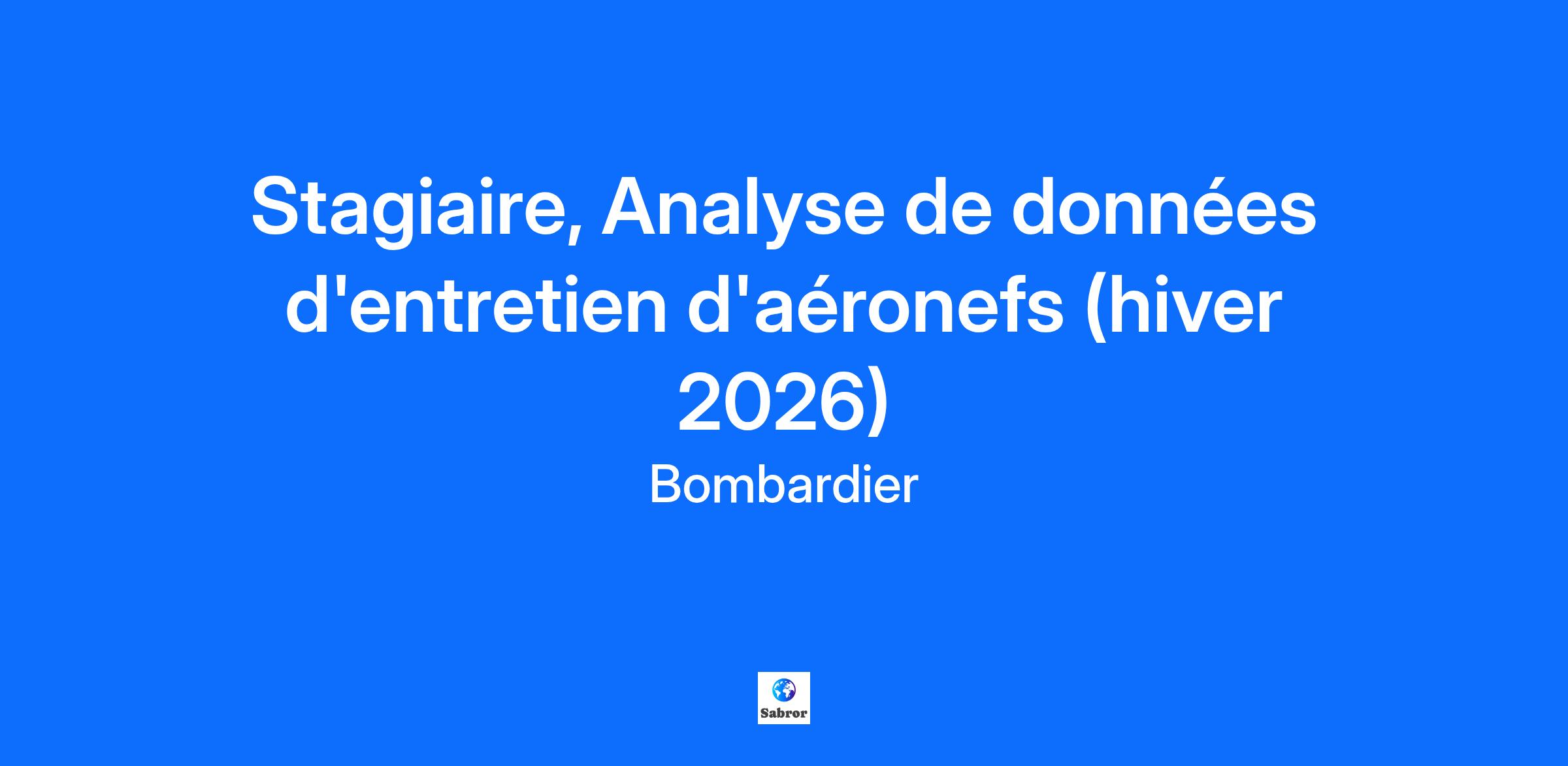 L’innovation est dans notre ADN… est-elle dans le vôtre?Bombardier est un leader mondial de l’industrie de l’aviation en créant des avions novateurs qui changent la donne sur leur marché. Ses produits et services fournissent des expériences de calibre international établissant de nouvelles normes en matière de confort-passager, d’efficacité écoénergétique, de fiabilité et de sécurité. Nous sommes une organisation mondiale axée sur la collaboration et l'esprit d'équipe. Votre billet d’embarquement comprendra… Plusieurs conférences : Rencontrez un.e exécutif.ve Envolée au féminin Apprendre davantage sur Bombardier : Conférence sur Les produits Bombardier Visites des sites Bombardier L’Académie d'apprentissage Bombardier De nombreuses opportunités de réseautage et d'échanges sociaux : Du bénévolat Réseauter pour réussir 5 à 7, repas entre stagiaires, et bien plus encore! Quelles sont vos contributions envers l’équipe? Soutenir le processus d'amélioration de la collecte des données de fiabilité d’Aéronefs pour assurer un haut niveau d'exactitude et d'exhaustivité des données. Créer de nouveaux outils et interfaces avec nos données en utilisant Oracle, Access, Excel avec VBA et PowerBI. Mettre à jour et documenter les processus et procédures au besoin. Comment vous épanouir dans ce rôle? • Vous êtes actuellement en train de terminer un diplôme en informatique / génie logiciel / électrique / aérospatial ou dans d'autres domaines connexes. Les domaines non liés à l'ingénierie seront également pris en compte.• Vous avez complété un minimum de 2 années d'études dans ce programme.• Vous avez de fortes capacités d’analyses.• Vous avez une connaissance technique approfondie des produits Microsoft.• Vous avez une bonne compréhension de la façon de manipuler les données dans MS Excel en utilisant VBA.• Vous avez les connaissances pour créer des requêtes et des filtres dans MS Access, à des fins d'analyse des données d'ingénierie.• Vous avez une connaissance de PowerBI et PowerAutomate pour créer des tableaux de bord et des rapports (atout)• Vous avez une connaissance de SAP, Salesforce.com, Oracle, Maximo, Azure, SQL et apprenstissage machine (atout)• Vous possédez d'excellentes compétences en anglais, des habiletés de communication et relationnelles• Vous êtes un joueur d'équipe très motivé avec un sens des responsabilités et un bon jugement. Information d’embarquement: Site: Centre Administratif (CA) Durée: 8 mois Travail flexible-Hybride Il est important de noter que nos opportunités de stage sont ouvertes aux étudiants et non aux nouveaux gradués. Tous nos stagiaires peuvent être appelés à voyager occasionnellement à l'extérieur du Canada pour des raisons de formation ou de travail.