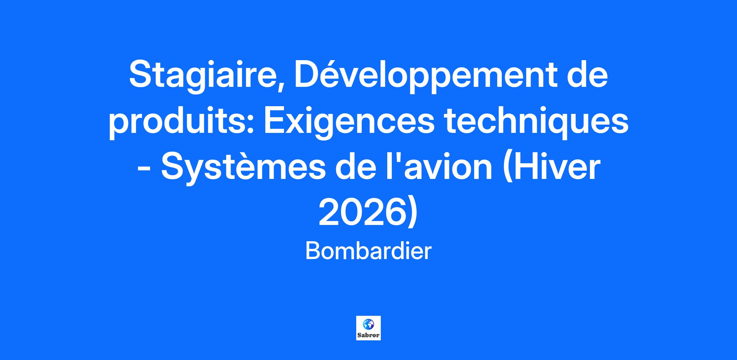 L’innovation est dans notre ADN… est-elle dans le vôtre?Bombardier est un leader mondial de l’industrie de l’aviation en créant des avions novateurs qui changent la donne sur leur marché. Ses produits et services fournissent des expériences de calibre international établissant de nouvelles normes en matière de confort-passager, d’efficacité écoénergétique, de fiabilité et de sécurité. Nous sommes une organisation mondiale axée sur la collaboration et l'esprit d'équipe. Votre billet d’embarquement comprendra… Plusieurs conférences : Rencontrez un.e exécutif.ve Envolée au féminin Apprendre davantage sur Bombardier : Conférence sur Les produits Bombardier Visites des sites Bombardier L’Académie d'apprentissage Bombardier De nombreuses opportunités de réseautage et d'échanges sociaux : Du bénévolat Réseauter pour réussir 5 à 7, repas entre stagiaires, et bien plus encore! Notre équipe… Vous rejoignez une équipe formidable où l'ouverture d'esprit aux nouveaux défis et aux nouvelles façons de faire est au premier plan, avec une rigueur qui se manifeste dans les architectures et les conceptions de l'avion et de ses systèmes qui sont à la fine pointe des futures mises en œuvre technologiques ! Nous couvrons les processus, la conception et les exigences qui soutiennent leur réalisation. Nous vous souhaitons la bienvenue !Quelles sont vos contributions envers l’équipe? Participer à la gestion des exigences techniques pour la conception d’un nouveau produit Revoir des documents techniques et en extraire les données clés Organiser l’information de façon claire, complète et intuitive Présenter les informations aux spécialistes Comment vous épanouir dans ce rôle? Vous êtes un(e) étudiant(e) en génie et vous avez un intérêt pour l’aéronautique Vous êtes curieux, rigoureux et méthodique Vous avez de bonnes capacités d’analyse Information d’embarquement: Site: Centre Administratif (CA) Durée: 8 mois Travail flexible-Hybride Il est important de noter que nos opportunités de stage sont ouvertes aux étudiants et non aux nouveaux gradués. Tous nos stagiaires peuvent être appelés à voyager occasionnellement à l'extérieur du Canada pour des raisons de formation ou de travail.