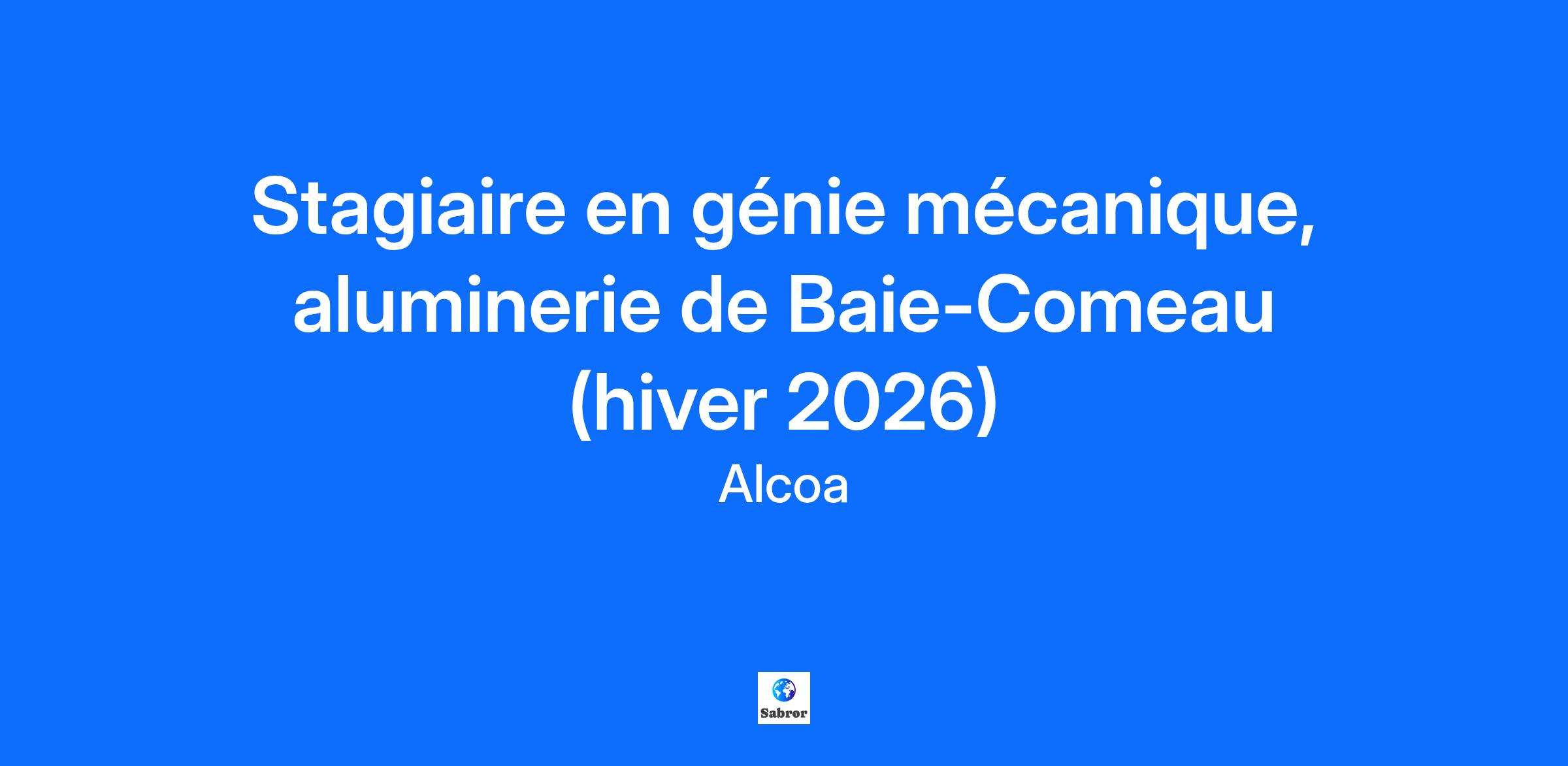 Shape Your World At Alcoa, you will become an essential part of our purpose: to turn raw potential into real progress. The way we see it, every Alcoan is a work-shaper, team-shaper, idea-shaper, world-shaper. Alcoa, Aluminerie de Baie-Comeau Être stagiaire chez Alcoa, c’est travailler avec des équipes dynamiques composées de gens ouverts aux nouvelles idées. Vous serez pleinement intégrés dans nos équipes et elles se feront un plaisir de partager leurs connaissances et expériences avec vous. Venez vous joindre à notre équipe afin d’acquérir une expérience des plus enrichissantes en milieu industriel! Alcoa au Canada c’est : Trois alumineries au Québec : Aluminerie de Deschambault, Aluminerie de Bécancour Inc., Aluminerie de Baie-Comeau 2 500 employés; 1 Centre d’excellence mondial; Un million de tonnes métriques de plaque, de lingot en T et de billette. Nous visons à intéresser, développer et retenir les meilleurs talents, en plus de créer un environnement où l’accent est mis sur le respect, la santé-sécurité, la protection de l’environnement et le développement continu, afin que chaque employé puisse contribuer au succès collectif. Session Hiver 2026 À propos du stage: Au sein du secteur entretien de l’usine, le ou la stagiaire aura à assister et intégrer l’équipe afin de : Développer une structure de recherche de pièces en lien avec la structure REX (Excellence en fiabilité); Développer la boucle de fiabilité et mettre à jour les listes de pièces pour le secteur des matières premières; Assister l’équipe maintenance dans différents projets. À propos de vous : Être étudiant(e) en génie mécanique ou industriel; Bonne connaissance d'Excel; Initiative; Autonomie; Capacité à travailler en équipe et aller vers les gens pour faire avancer les projets. Conditions de travail Vous ne demeurez pas dans la région de notre aluminerie? Vous pourriez être éligible à une prime pour votre logement de 600$; Formations complètes à votre arrivée pour vous préparer à notre environnement industriel; Tous les équipements de protection individuels vous seront fournis; Un service médical accessible aux employés; La possibilité de faire plus d’un stage avec nous. Heures de travail 40 heures par semaine Horaire de travail Horaire de jour, du lundi au vendredi. Salaire Échelle entre 28$ et 32$ de l'heure selon votre année d'étude. Dans cet affichage, le masculin est utilisé afin d’alléger le texte. Alcoa est fier d’être un milieu de travail offrant l'égalité des chances en matière d'emploi et d’être un employeur d’action positive. Seules les personnes sélectionnées dans le processus seront contactées. About the Location Alcoa's aluminum smelter in Baie-Comeau is the economic engine of Baie-Comeau and the Manicouagan region. The significant investments made in recent years have allowed the plant to look to the future with optimism. Working for Alcoa in Baie-Comeau means giving yourself the means to have an exciting and stimulating career, in an exceptional living environment where all services are accessible. Between the shores of the St. Lawrence and hundreds of lakes, rivers and trails, Baie-Comeau is an outdoor paradise and the ideal place to raise a family. We are values led, vision driven and united by our purpose of transforming raw potential into real progress. Our commitments to Inclusion, Diversity & Equity include providing trusting workplaces that are safe, respectful and inclusive of all individuals, free from discrimination, bullying and harassment and that our workplaces reflect the diversity of the communities in which we operate. This is a place where you are empowered to do your best work, be your authentic self, and feel a true sense of belonging. Come join us and shape your career! Your work. Your world. Shape them for the better. Shape your Career at Alcoa! As an Alcoan you are part of a global team committed to advancing sustainability and delivering excellence and innovation. As a values-based company, we Act with Integrity, Operate with Excellence, Care for People, and Lead with Courage. Join us and become an essential part of our purpose: to turn raw potential into real progress. We treat all people with dignity and we believe in inclusion, diversity and enabling all employees to grow and develop their careers with us, where they can pursue their passions. Discover the possibilities a career with Alcoa can have for you. Come shape your career with us! Careers @ Alcoa Sustainability @ Alcoa What we Believe in Diversity & Inclusion We also invite you to create an automated personalized Job Alert. It’s easy to do, new open jobs will automatically come to you! Press the “Sign In” button at the top right of this page and the log in screen will appear. If you have not already created an account, please do so now. It's easy. At the bottom right it will say “Create Account”. Simply click on that, submit your email address and a password. You will receive an email to validate your request. Once that is done when you log in you will see a tab at the top right that says “Job Alerts”. Click on that tab and check all your job preferences. All relevant open Alcoa jobs will come to you via email automatically as soon as they are live. How great is that? In addition, we will update you via email on a regular basis about what is going on at Alcoa based upon your interests!