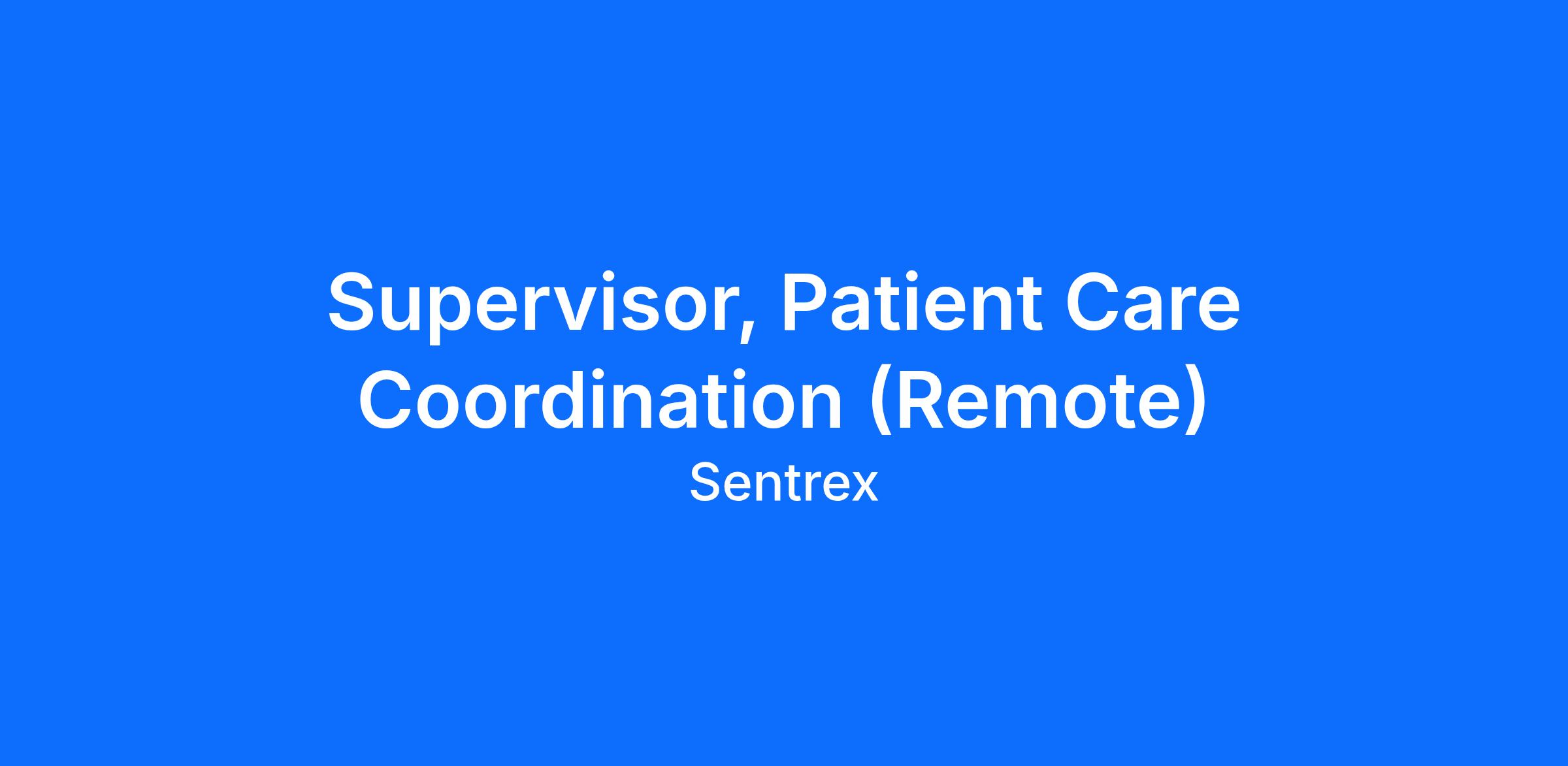 At Sentrex, we thrive when our people thrive. We are currently looking for a Supervisor, Patient Care Coordination, to be the supportive force that empowers our team of Patient Care Coordinators and PerCuro treatment clinics. The ideal candidate will be a proactive problem solver with exceptional leadership, communication skills, and meticulous attention to detail. The Supervisor, Patient Care Coordination, will be responsible for overseeing all aspects of Patient Coordination, including appointment scheduling, reminder calls, medication delivery coordination, post appointment reconciliation (internal and external), and internal coordination communication (with pharmacy, Clinic Solutions, PSP). They will provide continuous support for patients by utilizing their impeccable customer service skills and available resources to ensure patients receive optimal care throughout the PerCuro treatment clinic network with ease and in a timely manner.