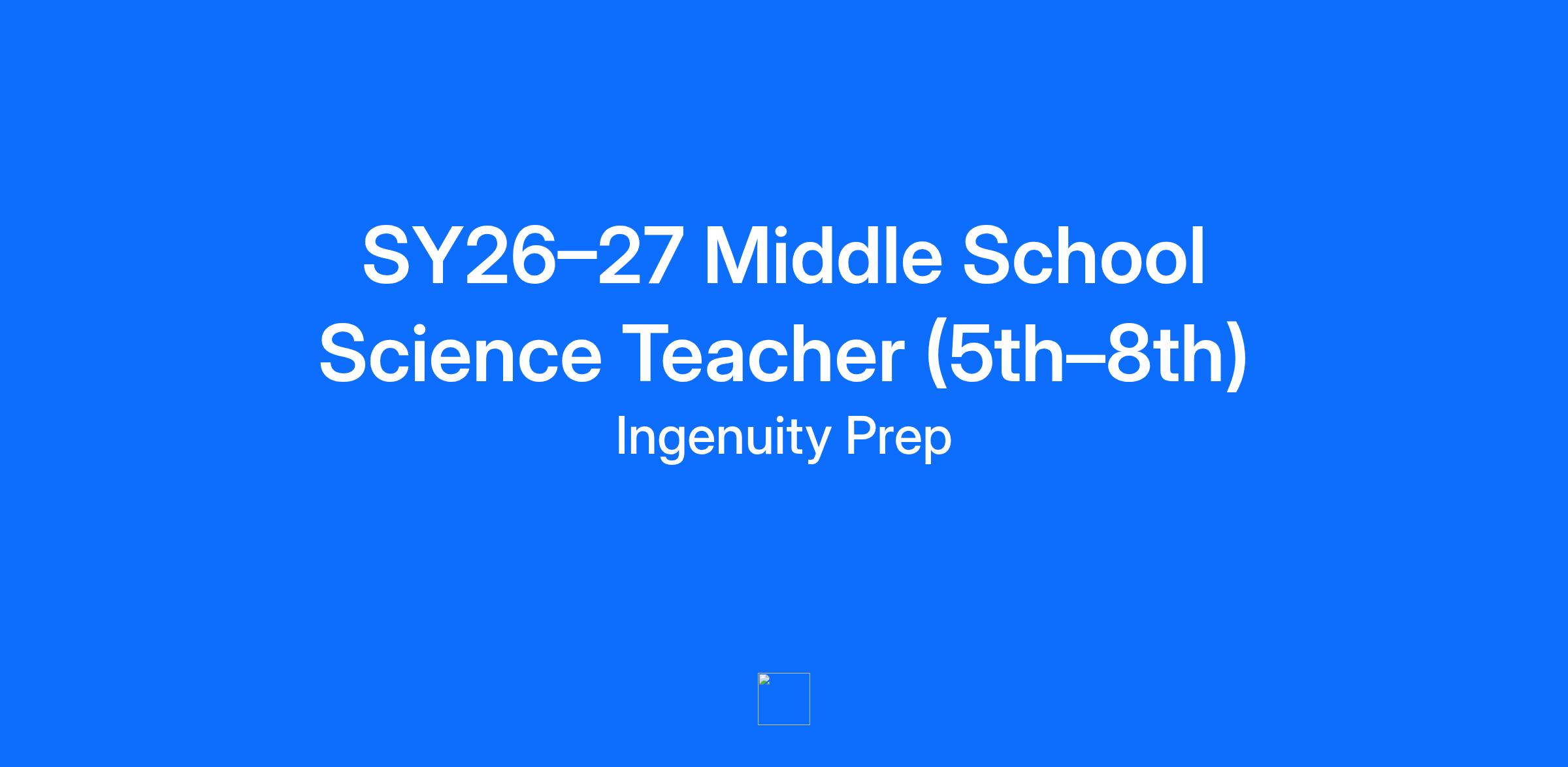 NOTICE: All Ingenuity Prep employees must be fully vaccinated against COVID-19 before their start date. All persons offered a position will be required to provide valid proof of vaccination prior to starting employment or must be approved for a medical or religious exemption. Ingenuity Prep prepares PreK, Elementary, Middle school students in Ward 8 to succeed in college and beyond as impactful civic leaders. Our innovative instructional model promotes small group learning for students, collaborative teaching teams, and robust coaching and professional development opportunities for teachers. Our teacher career ladder rewards strong performance over time, giving teachers the opportunity to earn higher levels of base compensation and bonuses as they demonstrate effectiveness with their students and colleagues. Our instructional leaders are charged with supporting teachers by providing clear expectations, ongoing feedback, and targeted development. We are looking for a Middle School Science Teacher who is deeply committed to students, has a passion for academic rigor and civic leadership, and wants to work closely with their colleagues to continue to build our program for Ingenuity Prep’s students and families during the 2026-2027 school year. WHAT WE’RE ABOUT * Mission: We’re closing the opportunity gap. Students and families in Southeast D.C. have too few options for high-quality elementary, middle, and high schools. Ingenuity Prep aspires to right this systemic injustice providing an exemplary educational option for Southeast D.C.’s students and families. * Model: We pair high expectations with high support. Too often, our students are underestimated. At Ingenuity Prep, an innovative teacher development model, paired with best-in-class training from strong instructional leaders, allows us to grow great teachers who, ultimately, lead high-expectation and high-support classrooms. * Results: Our students are defying expectations. Ingenuity Prep’s students outperform their neighborhood peers on rigorous, national, college-track assessments. Already out-performing many of their more privileged peers around the city, in the coming years, Ingenuity Prep’s students will provide an expectation-defying and achievement-gap-closing proof point — showing what our kids are capable of when we provide the right opportunities, expectations, and support. WHAT YOU’LL DO As an Middle School Teacher at Ingenuity Prep, you will: * Lead effective whole and small group instruction for students by planning and executing engaging and rigorous lessons based on provided curriculum. * Create a joyful, efficient, learning-focused classroom experience for students that leads to exemplary student growth -- both in academic achievement and in leadership skills. * Create a strong classroom culture built on trusting relationships and effective, efficient routines and procedures. * Engage in ongoing data analysis and lesson revision to ensure you are meeting all students academic needs, including daily exit ticket review and weekly assessment analysis. * Collaborate with colleagues to build an effective co-teaching relationship that ensures all students' academic and social emotional needs are met throughout the day. * Communicate and work closely with students’ families. * Receive regular, individualized coaching from IP’s instructional leadership team to grow your practice. * Work collaboratively in a co-teaching environment to establish routines, provide instruction and and analyze date to improve student outcomes WHO WE’RE LOOKING FOR Ingenuity Prep may be the right fit for you if: * You have experience and/or desire to serve as a lead middle school teacher in a low-income school. * You have a passion for providing rigorous instruction for students * You want to work closely with your peers in a collaborative teaching setting. * You want to work in a feedback-rich culture, and are eager to grow your practice through individual coaching and professional development opportunities. * You have a history of effectively using academic data to drive whole-group and small-group instruction. * You believe effective instruction is full of joy and rigor. * You have consistently built strong relationships with students and partnered with families as part of your plan for student success. * You have a track record of holding high expectations for yourself and your students. * You have a Bachelor's Degree from an accredited university. MORE ABOUT US Ingenuity Prep offers among the strongest compensation and benefits packages of any public charter school in Washington, D.C. Our compensation and benefits package includes: * Highly competitive compensation. * 100% of medical and dental premiums for employees paid for by Ingenuity Prep, along with 100% of dependent premiums. * 100% of employee’s short and long-term disability and life insurance plans paid for by Ingenuity Prep. * A minimum of two weeks maternity/paternity leave, up to 6 weeks, at 100% of pay (60% from IP and remaining pay from DC Paid Family Leave ) for all staff — regardless of gender. * A 100% match -- up to 3% -- on your 401K retirement plan. * A 100% Ingenuity Prep-paid cell phone plan. You can even bring your current number into our plan. * MacBook Air computer for professional and personal use. Salary: $64,890 - $81,039 (commensurate with 1-10 years of experience) Ingenuity Prep does not make hiring decisions on the basis of race, color, creed, ethnicity, national origin, gender, gender identity, sexual orientation, socio-economic background, age, disability, veteran status, religion, political affiliation or any other characteristic protected by state, federal, or local law. However, at this time, we do not provide job sponsorship for international candidates, and proof of COVID-19 vaccination is required prior to the first day of employment.