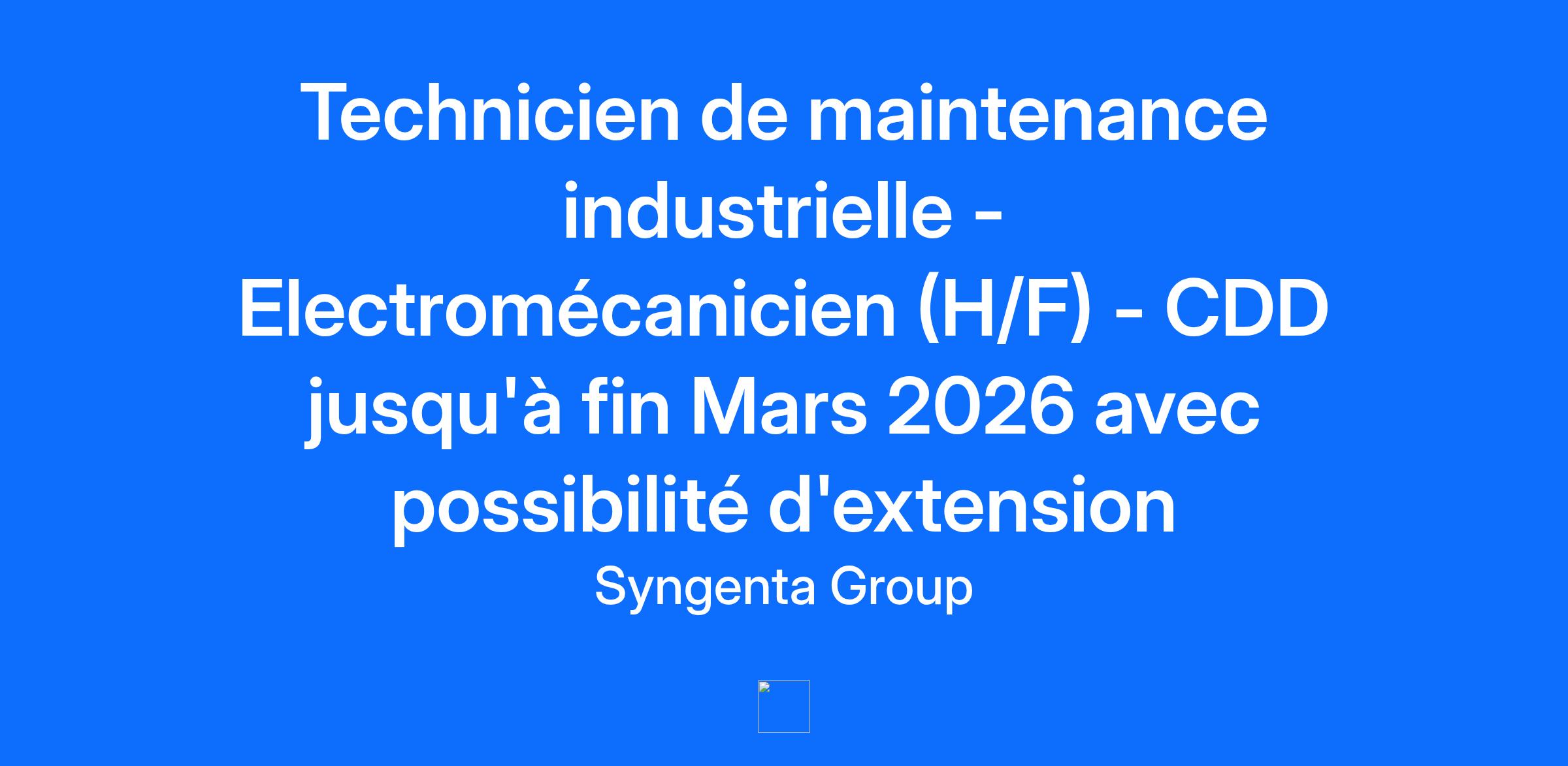 Description de l'entrepriseSyngenta figure parmi les leaders mondiaux pour ses activités. Le groupe emploie plus de 28000 personnes dans plus de 90 pays qui n’ont qu’un seul objectif: exprimer le potentiel des plantes. Par nos capacités scientifiques de premier plan, notre présence mondiale et notre engagement en faveur des clients, nous aidons à accroître les rendements et la rentabilité des cultures, à protéger l’environnement et à améliorer la santé et la qualité de vie. Pour plus d’informations sur Syngenta, nous vous recommandons de consulter le site www.syngenta.com.Description du posteEn tant que Technicien de Maintenance Industrielle - Electromécanicien (H/F) en CDD, vous serez sous la responsabilité des chefs d'équipe Maintenance et vos principales missions seront les suivantes :Préparer les interventions à l'aide des dossiers de construction et de maintenance, y compris les procédures de démontage et de remontage, les outils et les tâches de maintenance.Dépanner les installations défectueuses et contrôler leur bon fonctionnement.Effectuer des tâches de maintenance planifiées telles que le remplacement des pièces d'usure, le serrage des contacts électriques, le graissage des roulements et la tension des courroies.Documenter les interventions à l'aide d'un logiciel de GMAO et participer aux analyses de risques pour les permis de travail.Participer aux modifications, aux nouveaux travaux et à la mise au point des installations.Proposer des améliorations aux programmes et procédures de maintenance afin d'optimiser l'outil de production et de réduire la récurrence des pannes.Mettre à jour les schémas électriques et les dessins mécaniques à la suite de modifications.Assurer de façon périodique les astreintes techniquesQualificationsBAC Pro MEI / MSMA ou BTS en Maintenance Industrielle / Maintenance des Systèmes avec préférablement au moins 3 ans d'expérience en maintenance industrielleCapacité à interpréter les schémas électriques et les plans d'équipements mécaniques.Autonome, rigoureux et curieux avec un excellent relationnel et un esprit d'équipe.Maîtrise de l'anglais technique pour comprendre les notices et les documents.Syngenta s'engage pour la Diversité. Nous encourageons toutes les candidatures indépendamment de l'origine sociale et culturelle, de l'âge, du genre, du handicap, de l'orientation sexuelle ou des croyances religieuses. Actuellement, Syngenta a mis en place un ensemble de mesures dans le cadre de la lutte contre la propagation du Covid19.Informations complémentairesUn salaire compétitif13em moisJours de congés payés légaux + RTT Différentes primes selon nature du poste et horairesRestaurant d'entreprise sur siteAvantages CEUne mutuelle avec une prise en charge à 60% de l'entreprise Un plan de retraite supplémentaire (possibilité d'y placer des jours RTT CP non utilisés)Des opportunités de carrière ainsi que des possibilités de développement individuel et de formation continueUn environnement de travail favorisant l'agilité, la diversité et le travail d'équipeUn travail responsable et varié dans une entreprise orientée vers l'avenir
