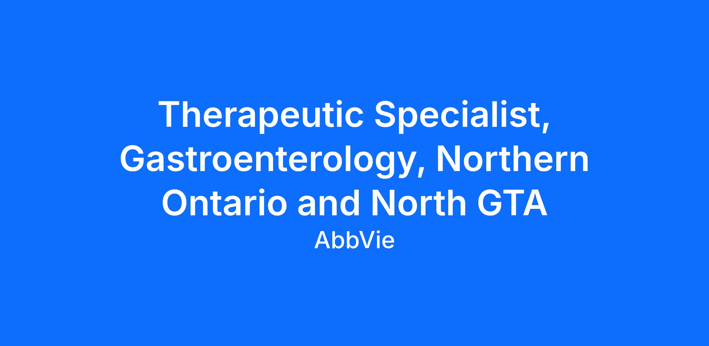 Are you looking for an exciting full-time career, where development and high-performance are valued? AbbVie Canada is looking to connect with a Therapeutic Specialist to join our commercial sales team. This role will cover the Northern Ontario and North GTA territory.