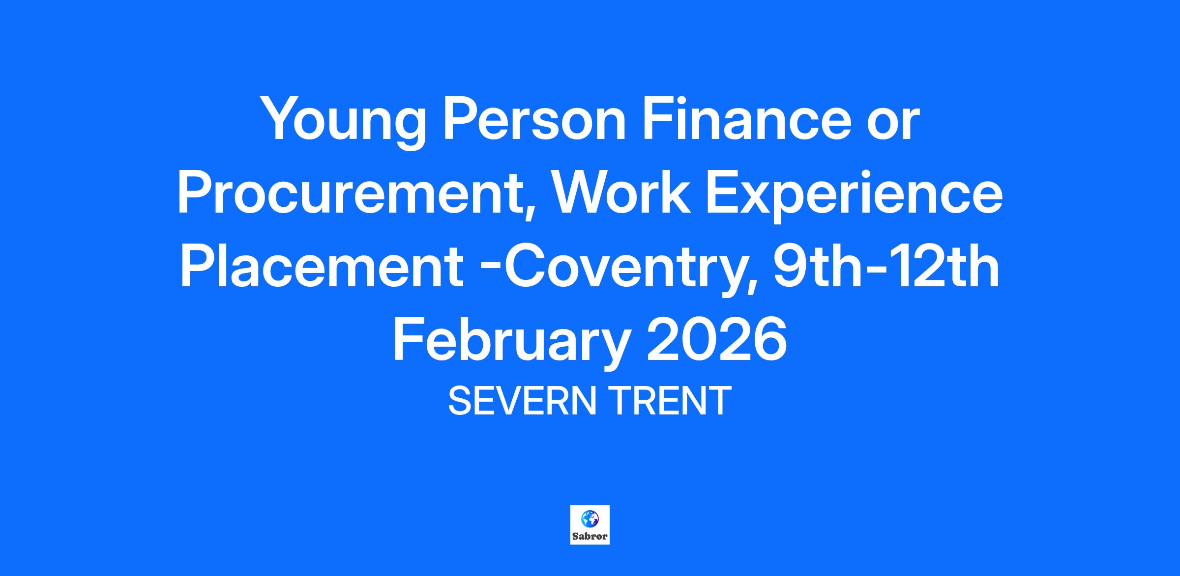 Student Finance or Procurement, Work Experience Placement –Coventry, 9th-12th February 2026 Location: STC-Severn Trent Centre, 2 St Johns Street CV1 2LZ Coventry Date – Monday 9th – Thursday 12th February 2026 (4-days) Who it's for: Young individuals between 14 and 18 years old, who are interest in work experience What’s This All About? Curious about how businesses manage their money and resources? This placement gives you the chance to see how either our finance or procurement teams work. You might shadow fixed asset specialists or rotate across the Group Finance team, learning how we track spending, manage big projects, and ensure value for money through smart purchasing decisions. You might also get exposure to procurement processes (like supplier selection and contract management) seeing how we source goods and services to keep the business running efficiently. Along the way, you’ll pick up useful skills like teamwork, problem-solving, and professional communication—great for any future career! What You’ll Learn: Communication – Talking and listening clearly Teamwork – Working with others to get things done Problem Solving – Thinking through challenges Confidence – Sharing your ideas and asking questions Time Management – Staying organised and focused Organisation – Keeping things tidy and on track Who Will Support You? You’ll be guided by friendly staff who will help you settle in, answer your questions, and make sure you get the most out of your time with us. What You’ll Take Away: By the end of your placement, you’ll have: A better idea of what it’s like to work in a professional environment New skills you can use in school and future jobs Great experiences to talk about in interviews or on your CV Important Notice – Research Trial Participation This work experience opportunity is part of a research trial being conducted by Severn Trent in partnership with Ipsos and the Youth Futures Foundation. The trial aims to understand how work experience impacts young people’s skills and future career outcomes. By applying for this placement, you are also consenting to take part in the research trial. This involves your application data being used for research purposes and you may be invited to complete short surveys or interviews (participation in these is optional). If you are under 16 years old, you must upload a signed parental consent form with your application for it to be considered. You will be asked to confirm you have attached your parental consent in the application, Consent will be verified and check before approving your eligibility See website for additional information, you must consent to take part in our work experience programme.